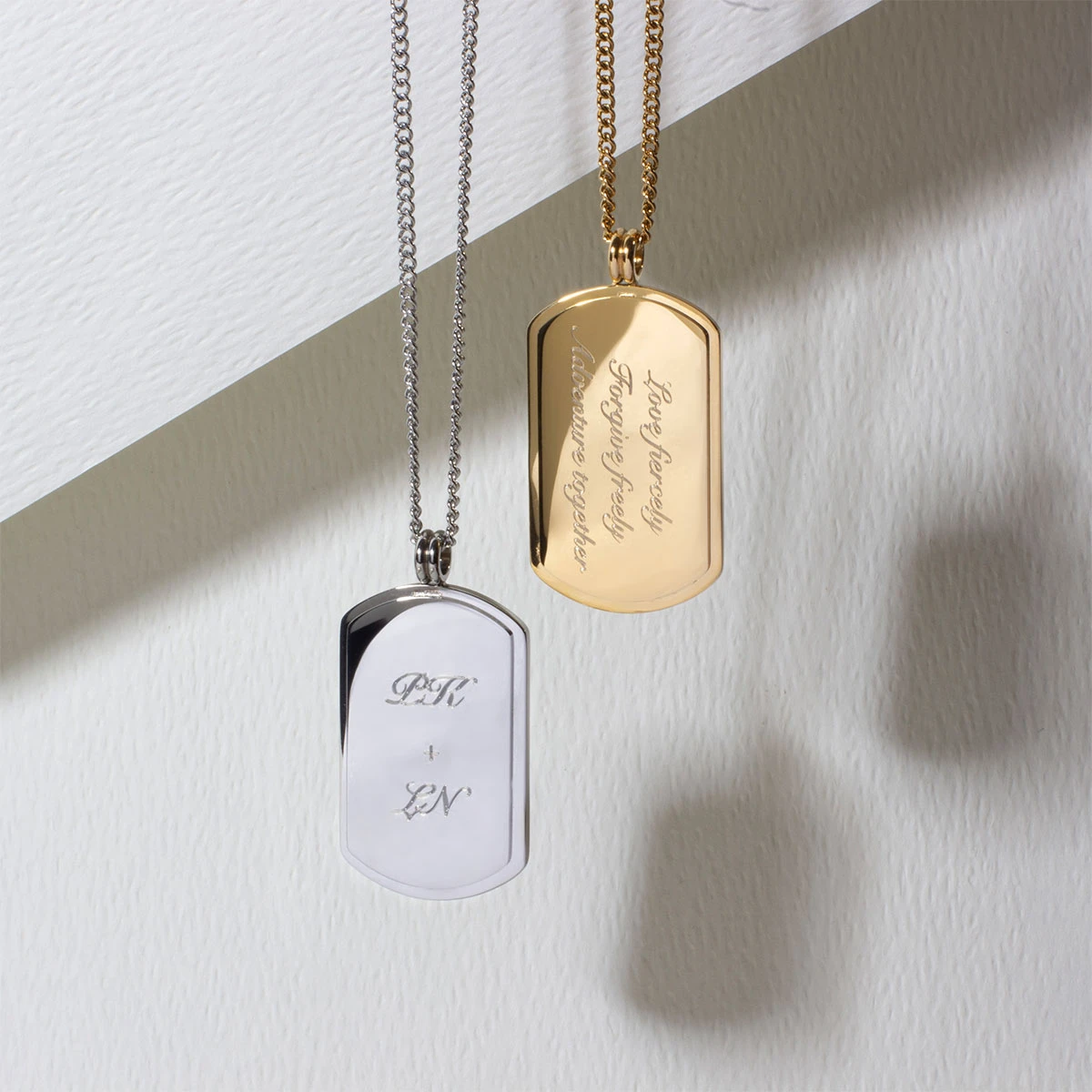 A modern twist on a classic piece, the pendant boasts a raised plate on the front surface of the tag, a perfect canvas for an engraved message, and a signature double bail.