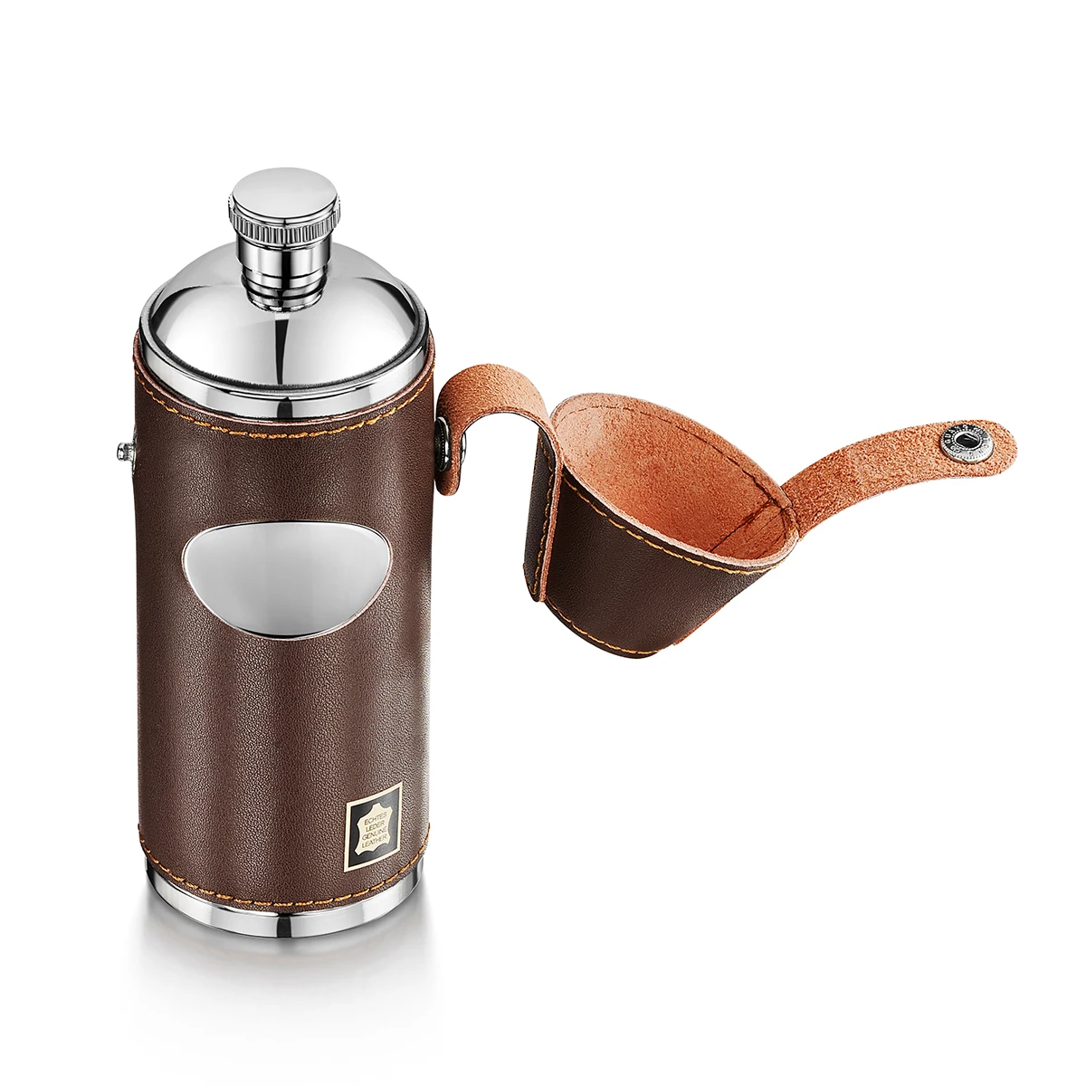 Leather hunters hip flask personalised with custom engraving on stainless steel surface. The genuine real brown leather beautifully sets off the metal chrome features and brings a tactile finish to a stunning men’s accessory which is engraved with the finest quality diamond-tipped cutter. For on-the-go refreshment of something special, this flasks contains four stainless steel cups for sharing your preferred drink wherever you might be which stack neatly on top of the flask.