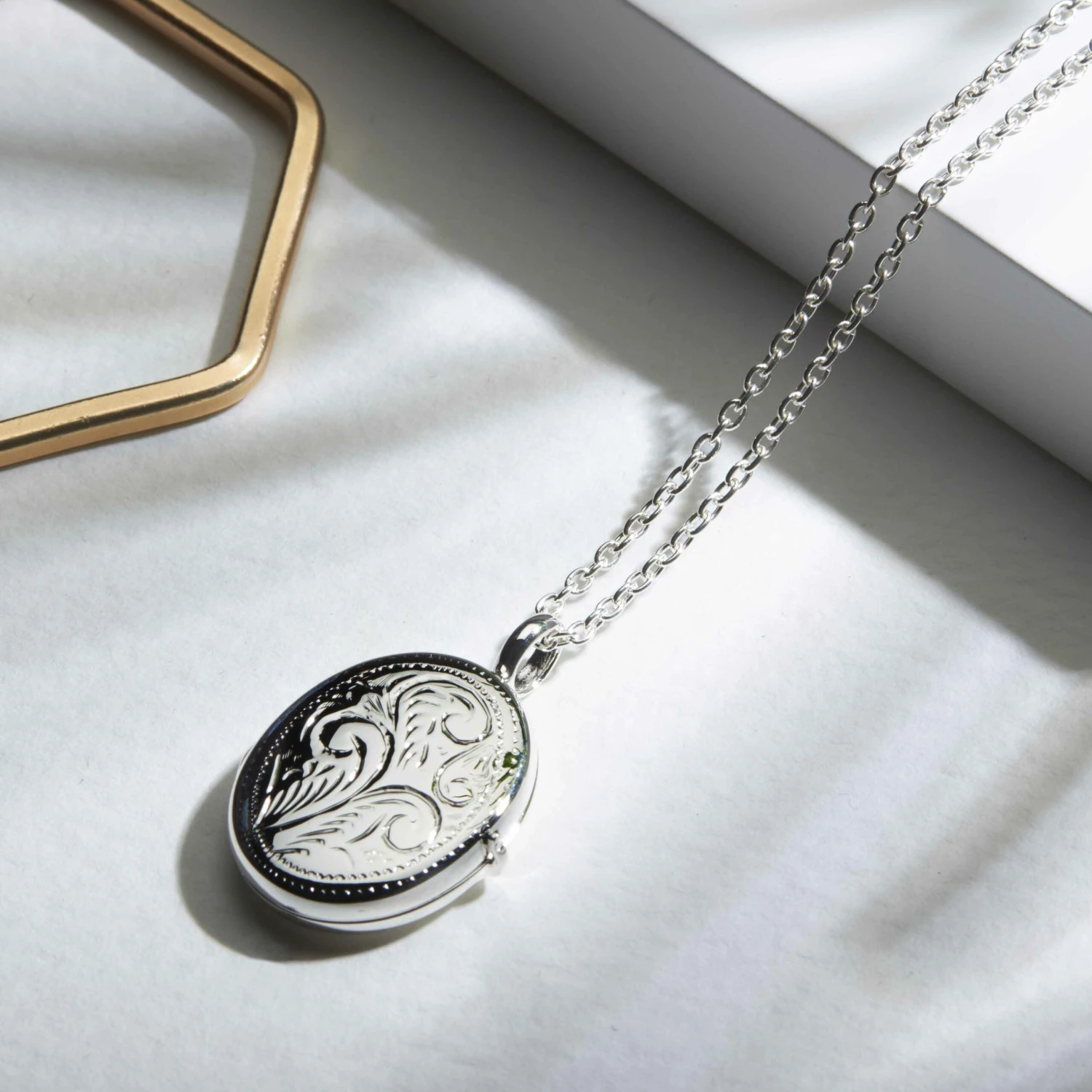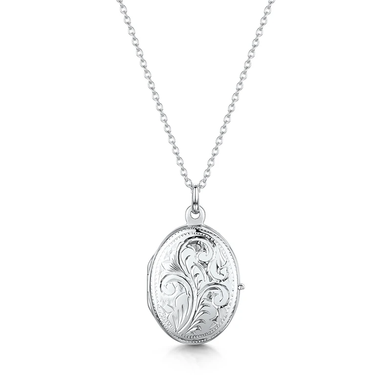 Little Oval Silver Locket with hand engraved scroll detail. This small but perfectly formed locket necklace showcases skilled artisanal craftsmanship in the intricate detail on the front of the piece. Graceful lines and an exquisite finish are the hallmarks of this item, making it a wonderful locket which is sure to become a favourite of the wearer and a very special possession for years to come.