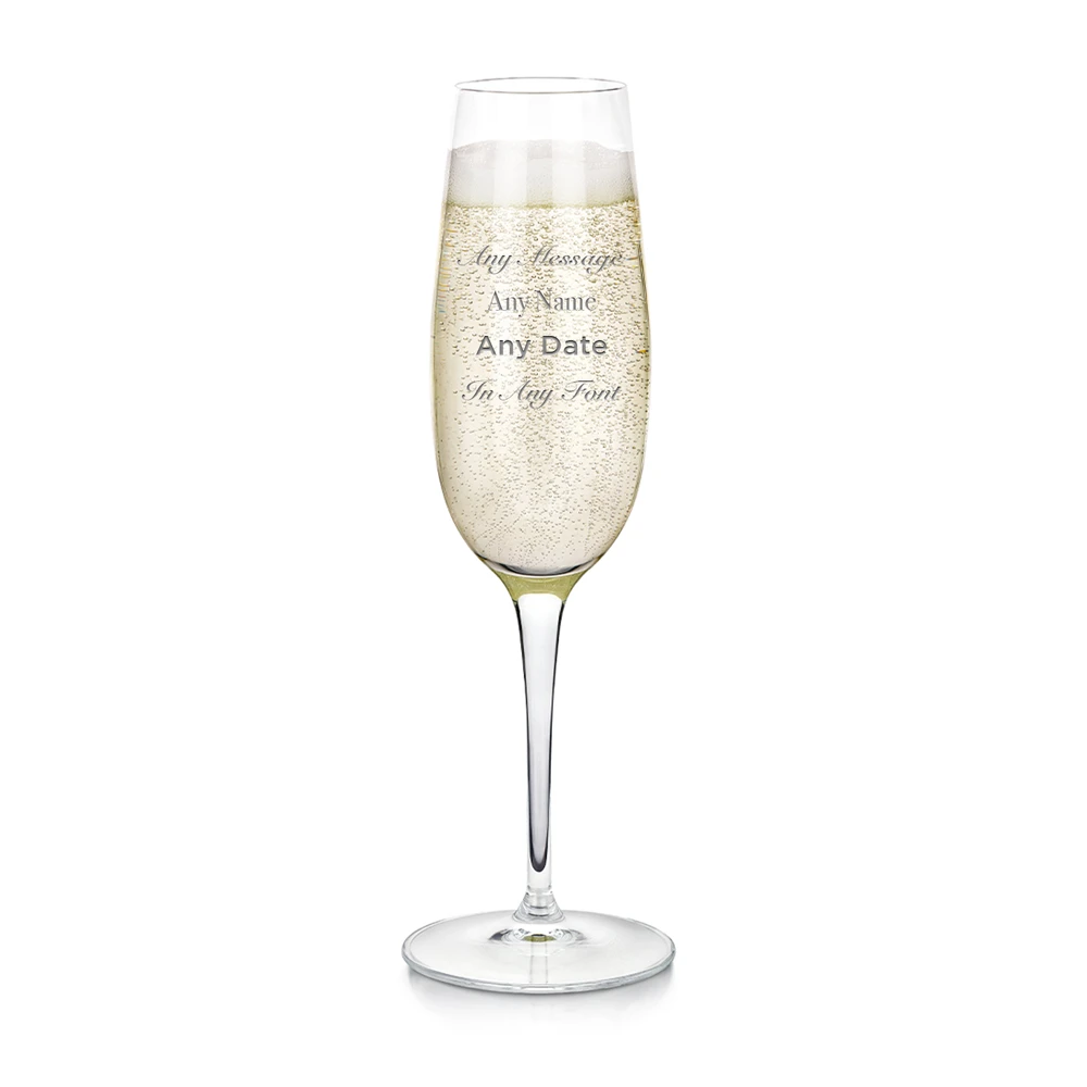 Sophisticated long stem champagne glass from the esteemed Italian glass house, Luigi Bormioli. Made in the foothills outside Bologna, superior crystal glass is used to create elegant stemware, bringing traditional craftsmanship, high-tech manufacturing and innovative design together to create a stylish and European classic piece. The glass is finished with precision laser engraving to create a beautiful gift.