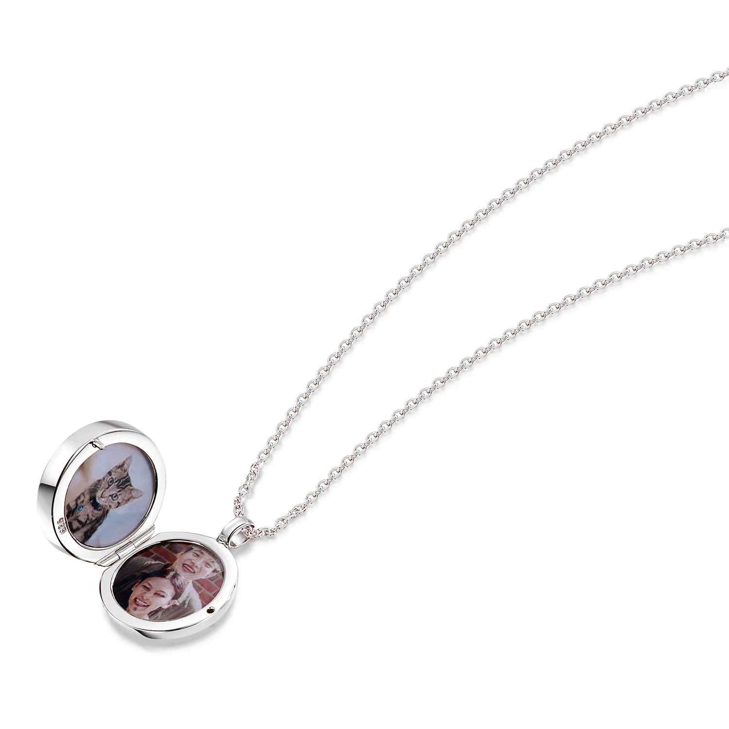 The personalised silver round locket measures 18mm in diameter. The standard chain offers an adjustable length of either 16 or 18 inches.