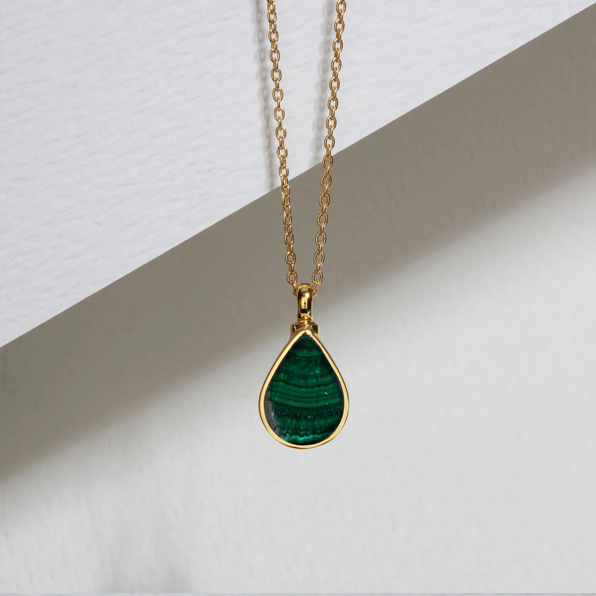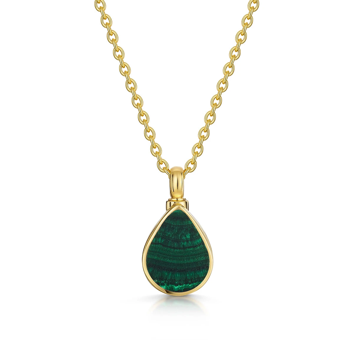 Crafted from 925 sterling silver and plated with 18K gold, this LOVELOX teardrop urn pendant and chain features a stunning malachite stone, symbolising eternal love and connection. Effortlessly access the discreet urn with its concealed screw-top mechanism – simply twist the bail until it opens. Complete with a convenient funnel and poker, insertion of precious ashes is an easy process.