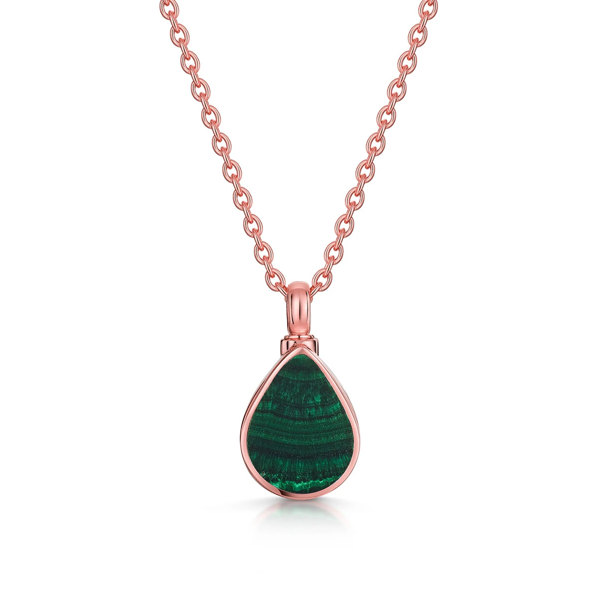 Crafted from 925 sterling silver and plated with 18K rose gold, this LOVELOX teardrop urn pendant and chain features a stunning malachite stone, symbolising eternal love and connection. Effortlessly access the discreet urn with its concealed screw-top mechanism – simply twist the bail until it opens. Complete with a convenient funnel and poker, insertion of precious ashes is an easy process.