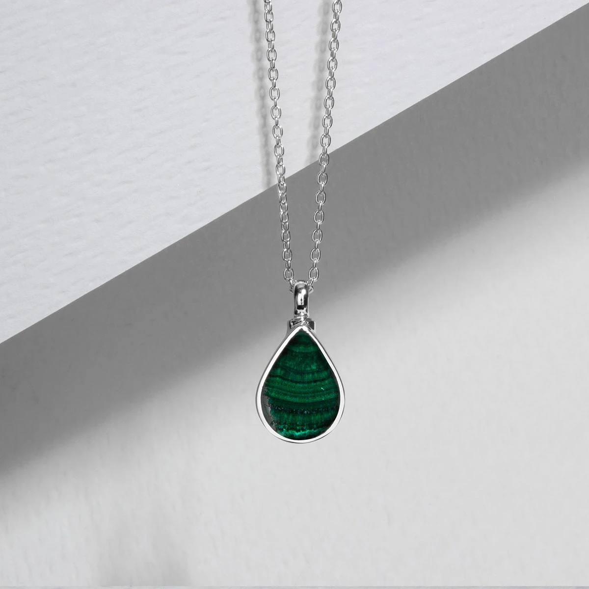 Crafted from 925 sterling silver, this LOVELOX teardrop urn pendant and chain features a stunning malachite stone, symbolising eternal love and connection. Effortlessly access the discreet urn with its concealed screw-top mechanism – simply twist the bail until it opens. Complete with a convenient funnel and poker, insertion of precious ashes is an easy process.