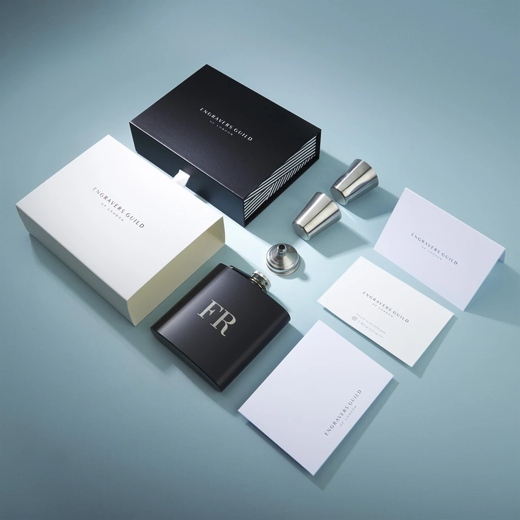 The 6 oz engraved hip flask measures 10.5 cm high by 8.5 cm wide and is delivered in a stunning jet-black luxury gift box with optional gift card. A pouring funnel is included.