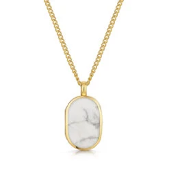 This small dog tag men’s locket and chain from LOVELOX is a compact and refined piece crafted from 925 sterling silver plated with 18K gold and features a howlite gemstone, known for its calming and soothing properties.