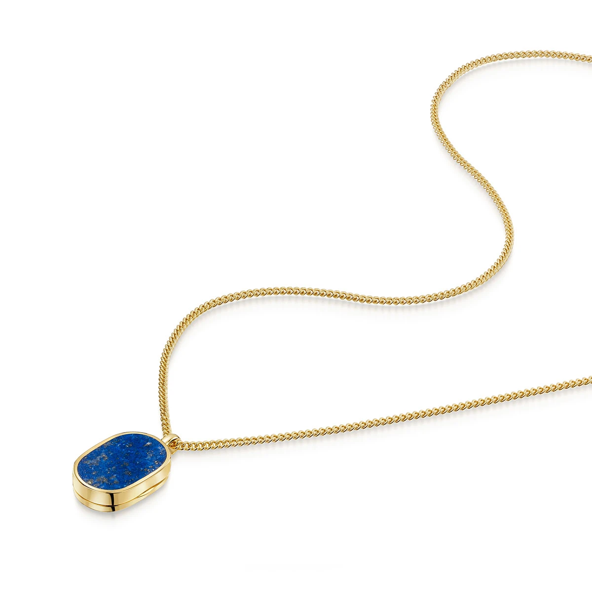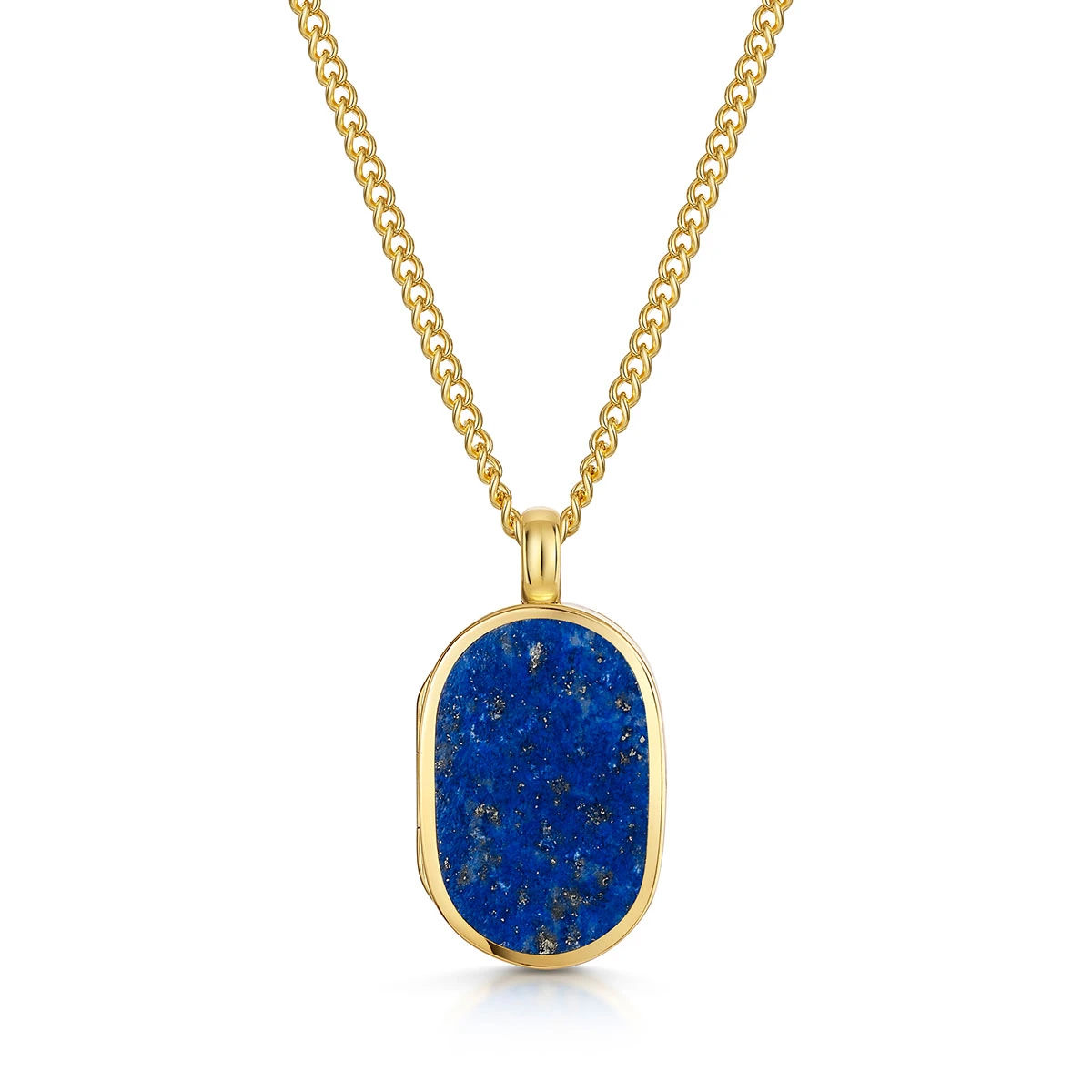 This small dog tag men’s locket and chain from LOVELOX is a compact and refined piece crafted from 925 sterling silver plated with 18K gold and features a lapis lazuli gemstone, known for its protective and healing properties.