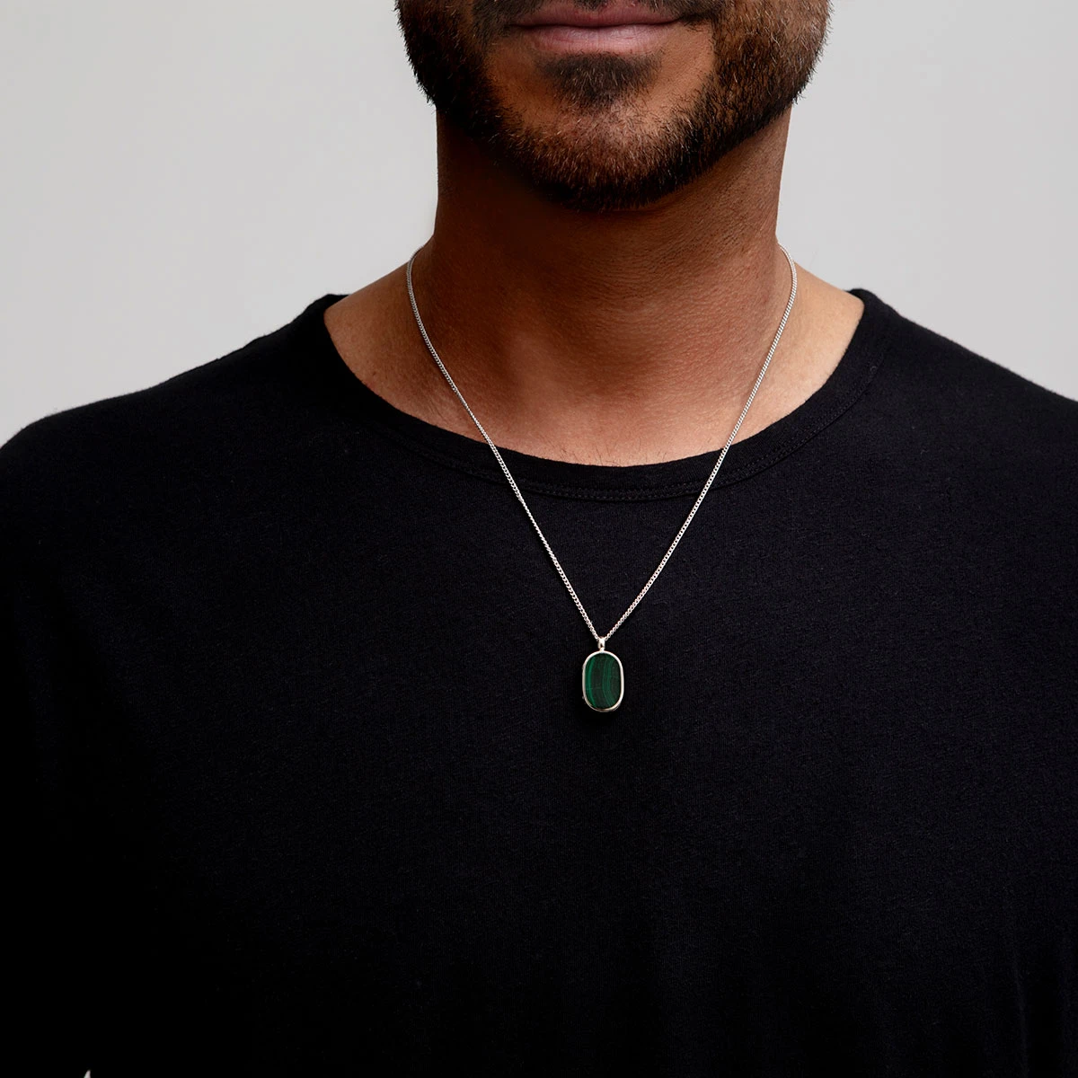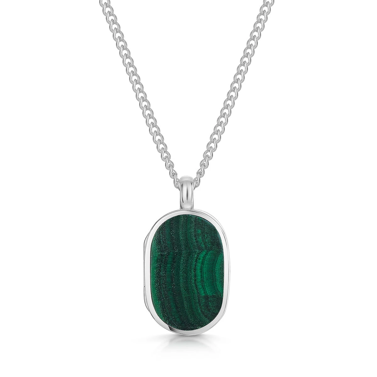 This small dog tag men’s locket and chain from LOVELOX is a compact and refined piece crafted from 925 sterling silver and features a malachite gemstone, known for its creative and inspirational properties.