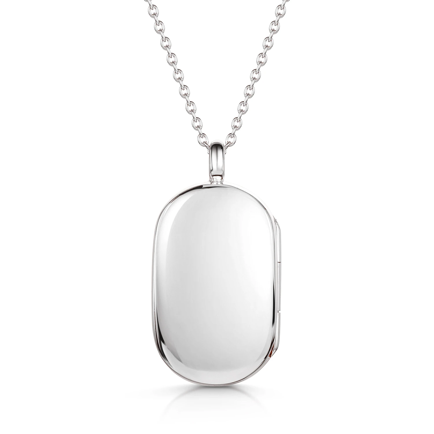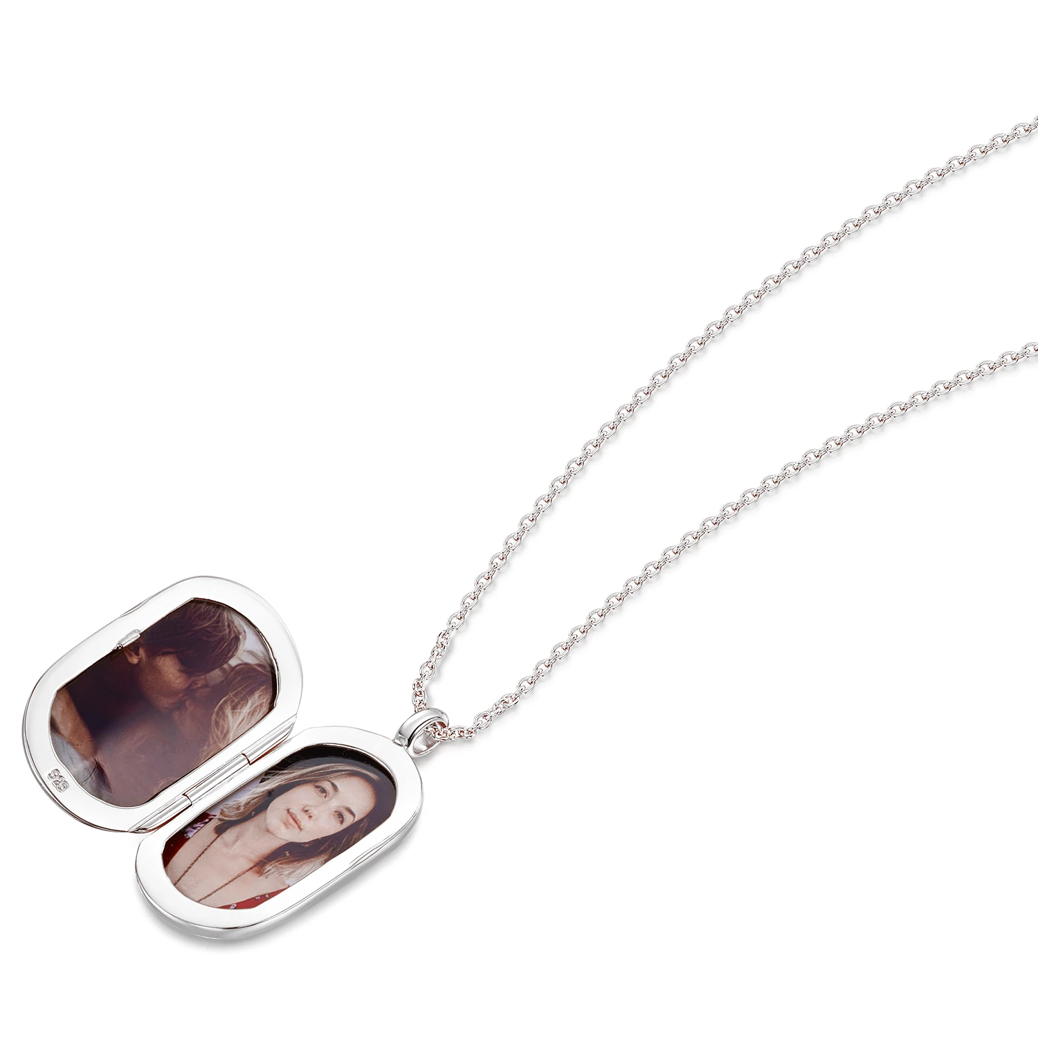 The engraved silver locket measures 18mm at widest, 30mm in height, with the solid silver chain running 18 inches long.