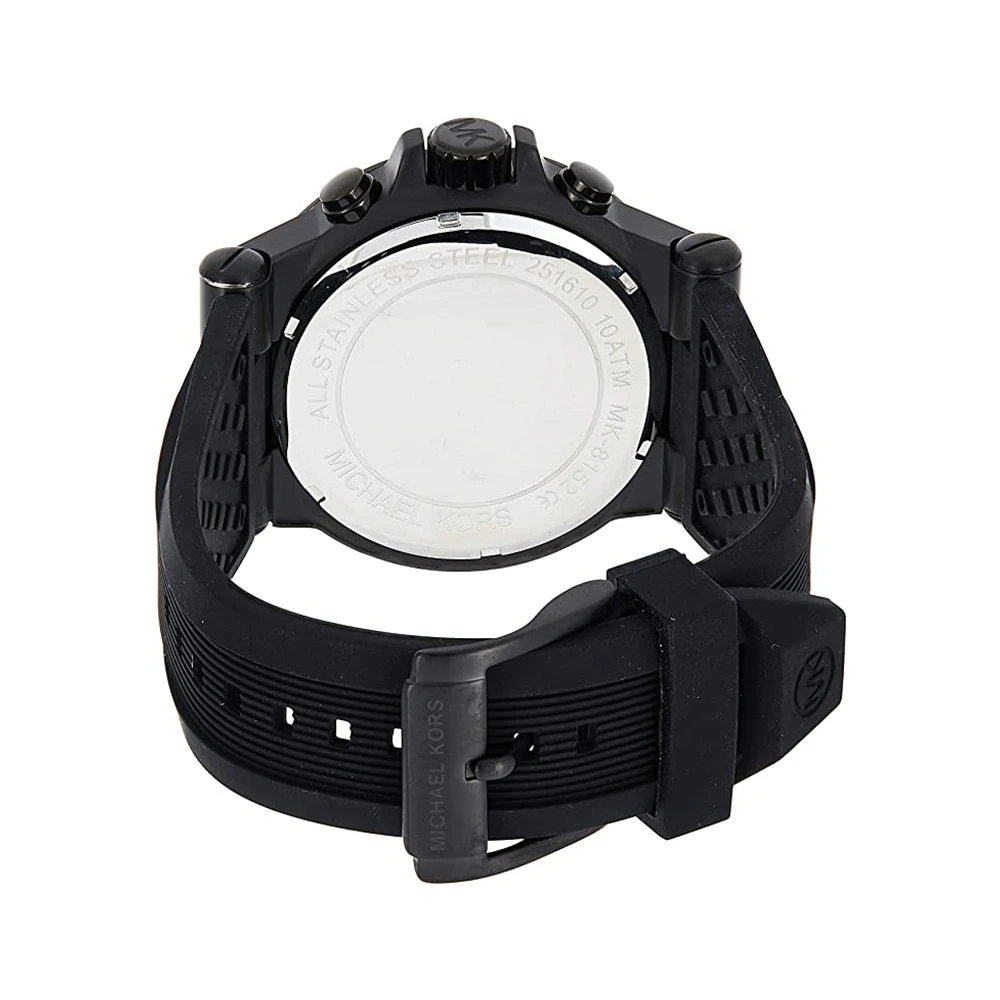 Oversized men’s engraved black watch with black silicone strap from Michael Kors. This timepiece speaks to the design aesthetic of Michael Kors, bringing together masculine styling with eye-catching looks. Featuring a stainless steel case and chronograph mechanism for measuring time over distance, this watch is the ultimate combination of precision and style. A diamond-cut engraving on the reverse of the case with a personal message finishes the beautiful gift.