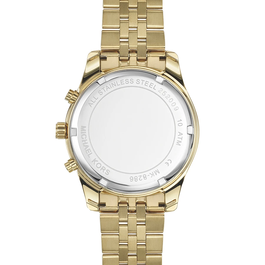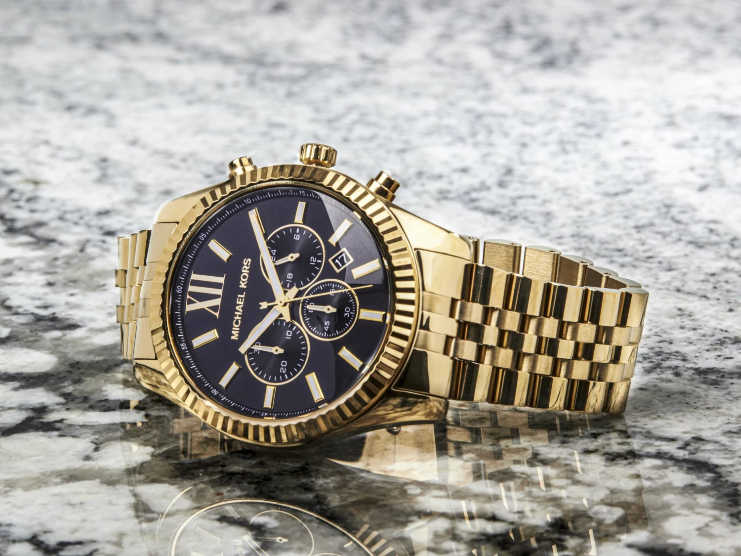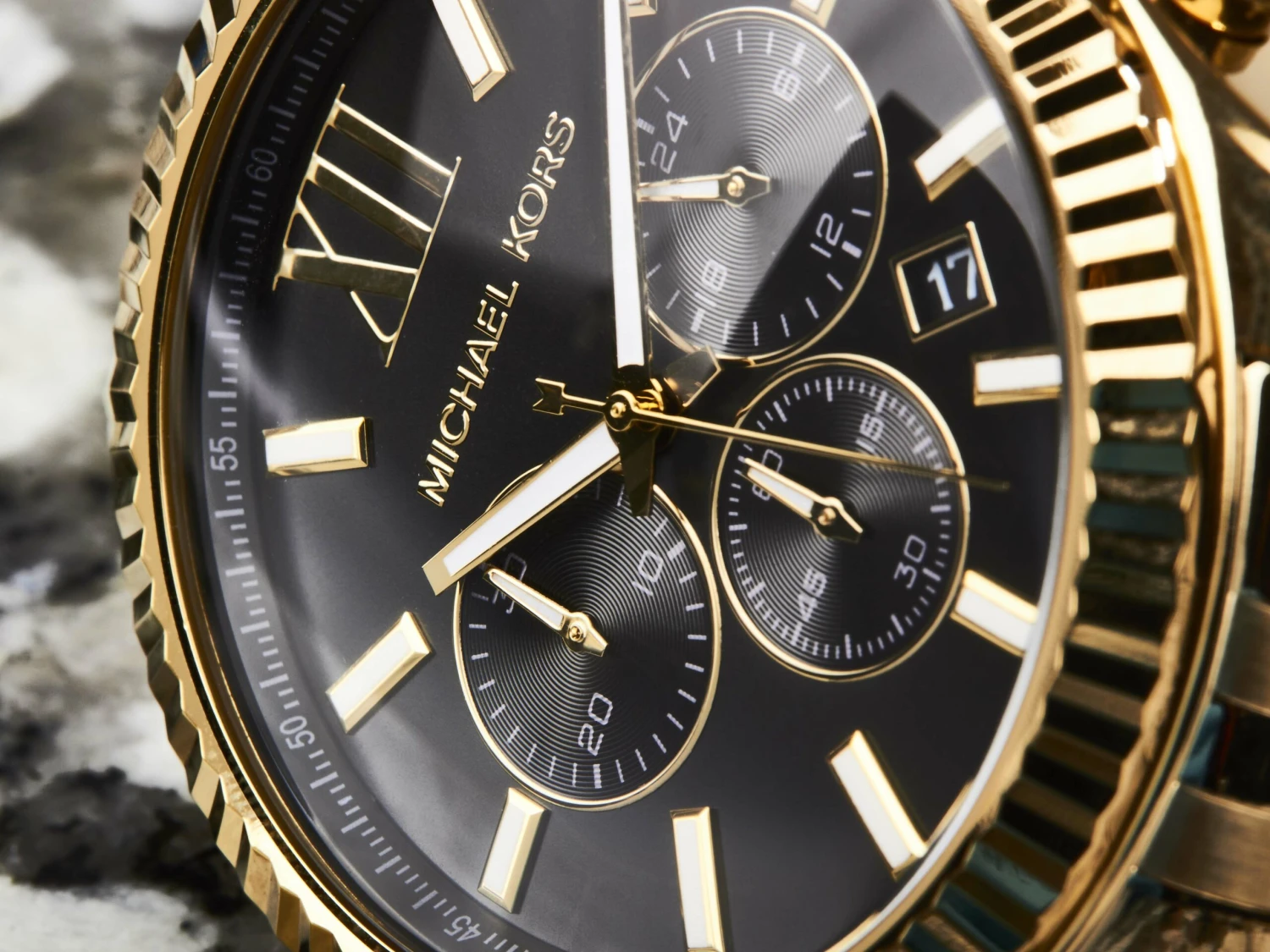 Chunky gold men’s engraved watch with black dial from Michael Kors. This extra large timepiece speaks to the design aesthetic of Michael Kors, bringing together masculine styling with eye-catching looks. The feather-cut bevel and the traditional bracelet strap offer a crisp contrast with the black dial. A diamond-cut engraving on the reverse of the case with a personal message finishes the beautiful gift.
