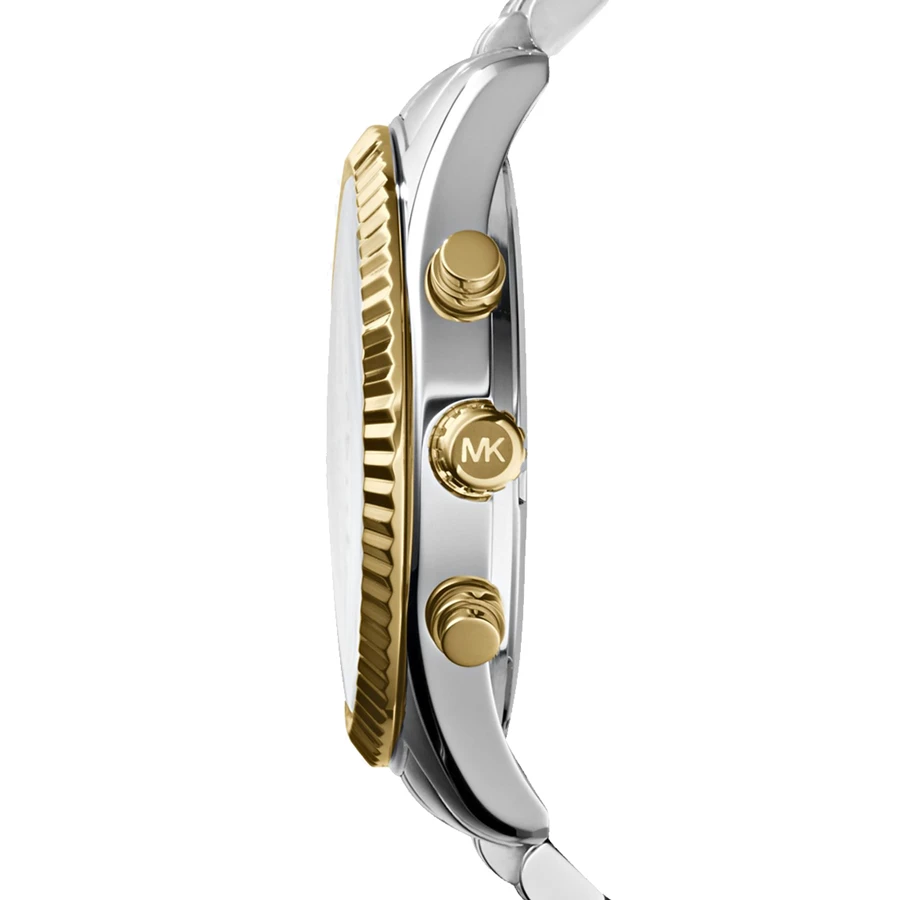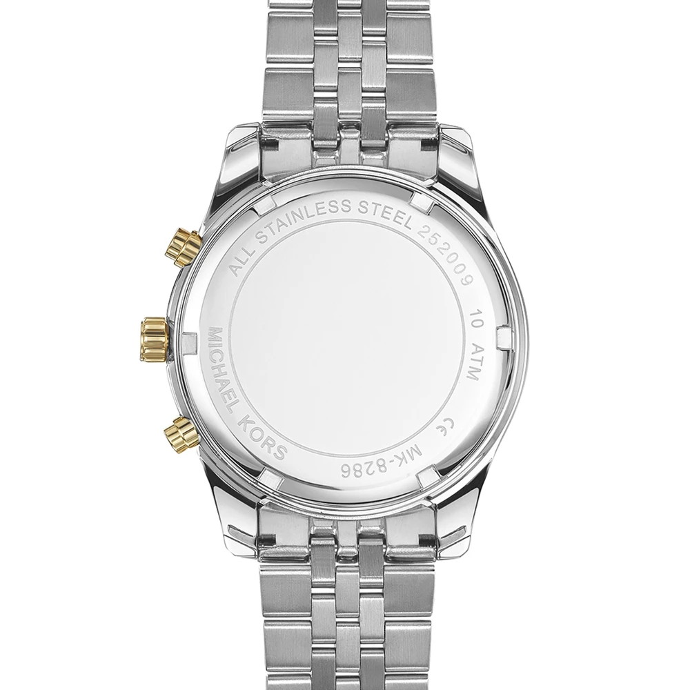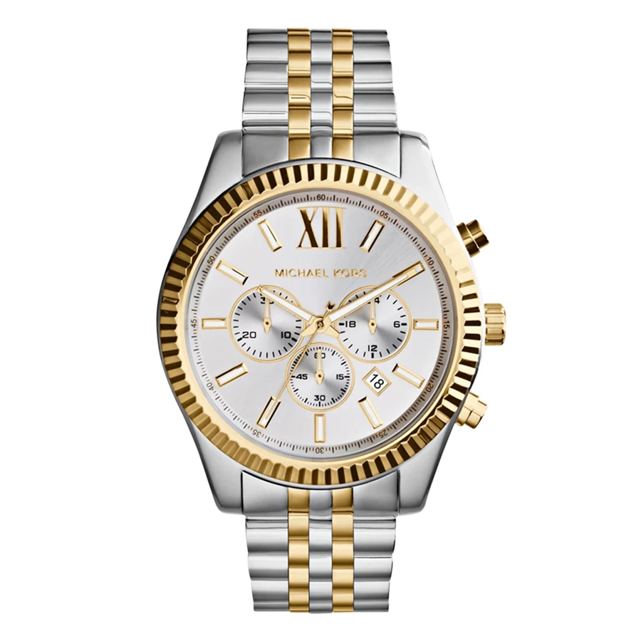 Chunky silver men’s engraved watch with gold detailing from Michael Kors. This extra large timepiece speaks to the design aesthetic of Michael Kors, bringing together masculine styling with eye-catching looks. The feather-cut bevel and gold elements offer a striking watch of contemporary appearance. A diamond-cut engraving on the reverse of the case with a personal message finishes the beautiful gift.