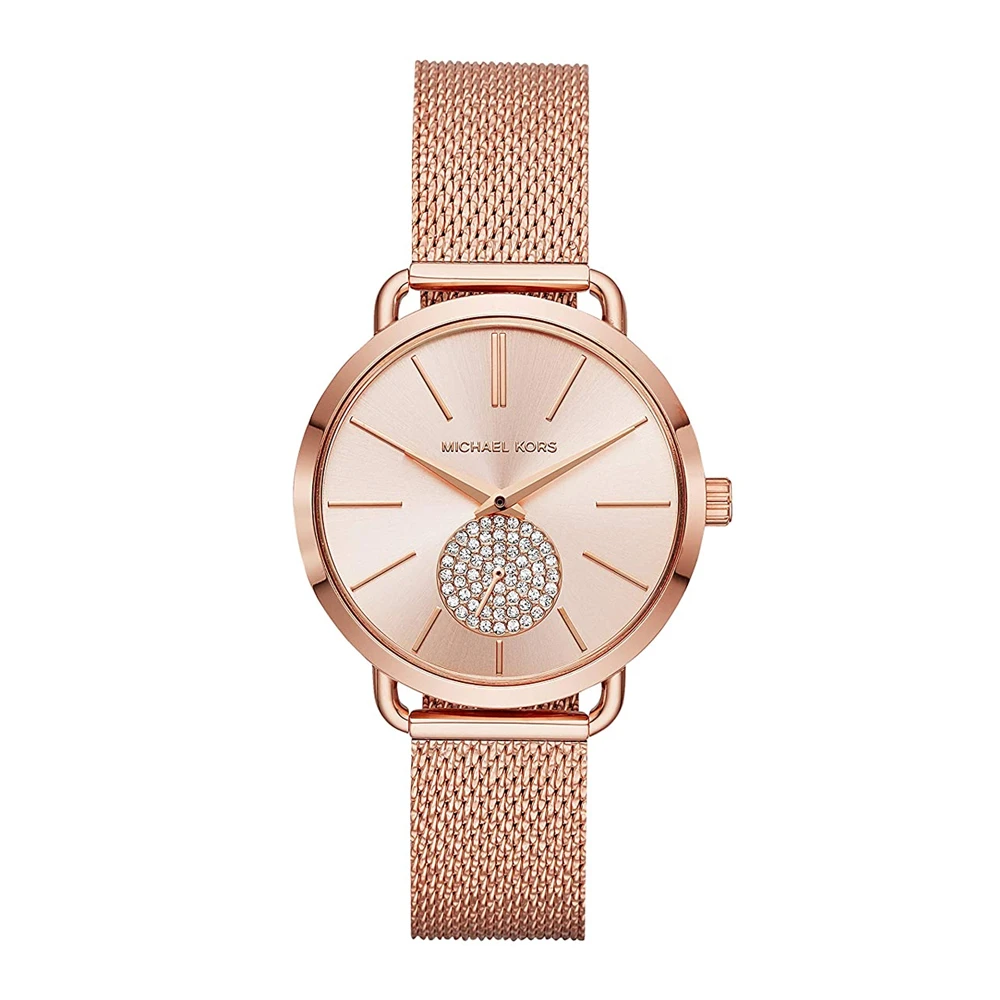 Michael Kors engraved ladies rose gold watch with contemporary mesh strap. This modern timepiece offers a feminine sensibility, combining smooth lines with delicate detail. A clean and simple dial is embellished with elegant batons and a cluster of brilliant diamantes, complemented beautifully with an intricately woven mesh bracelet. The watch is expertly engraved on the reverse of the case with traditional diamond-tipped cutters for crisp and enduring impression.