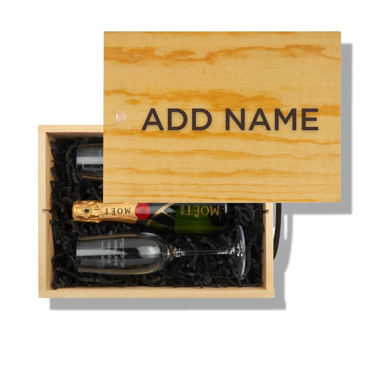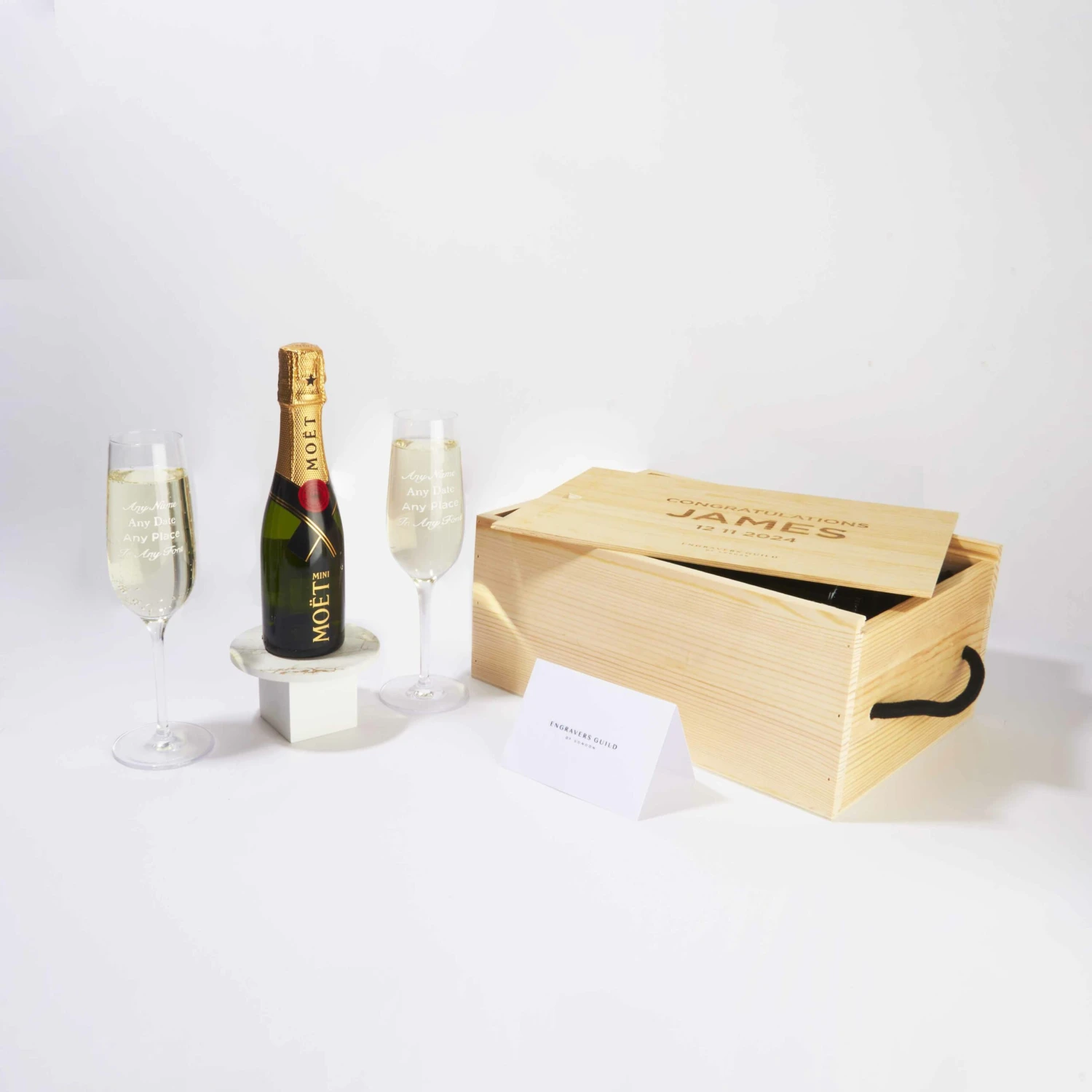 Your wooden gift box includes: 2x Dartington Crystal personalised champagne flutes, 1x Moet & Chandon Imperial Brut Champagne (200ml), 1x wooden crate box