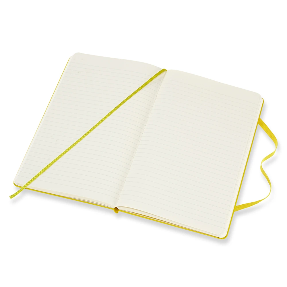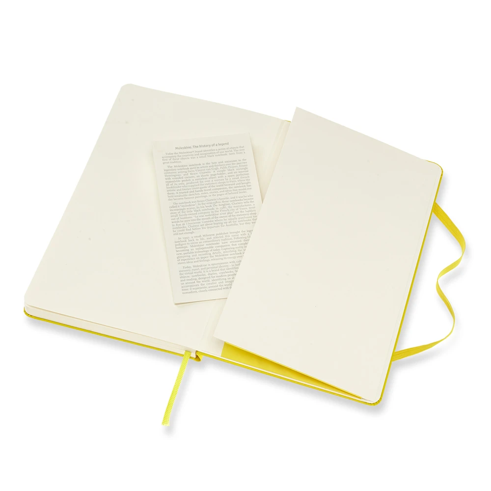 In keeping with all of Moleskine’s Classic Notebooks, this jaune edition has a matching elastic strap for keeping the contents secure when not in use as well as a coordinating bookmark ribbon. The expandable pocket on the inside-back cover allows room for loose scraps and keepsakes, while the ‘In case of loss’ stamp on the inside-cover allows you to mark your ownership of this personal piece.