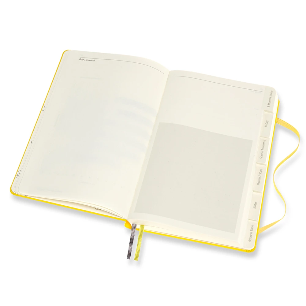 The notebook includes six sections: 9 Months to Go, B-Day, Special Moments, Health & Care, Notes and Addresses. Each section has a handy structured layout to guide your notes, as well as enough blank space for you to freely record events however you choose.