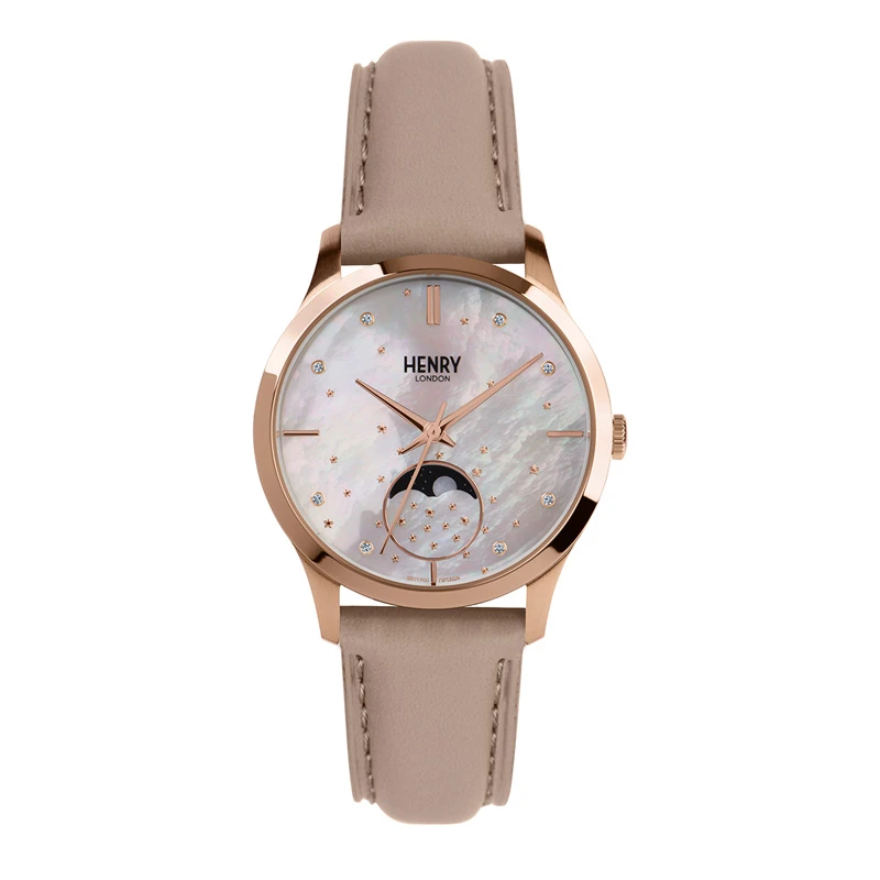 Moon-phase ladies engraved watch from Henry London. This beautiful timepiece features light and sophisticated styling with nude leather strap, mother of pearl dial and moon-phase inset. Showcasing a series of zirconia stones, the face of the watch mirrors a clear night sky. Gold batons and hands bring a balance of colour, creating a contemporary ladies watch.