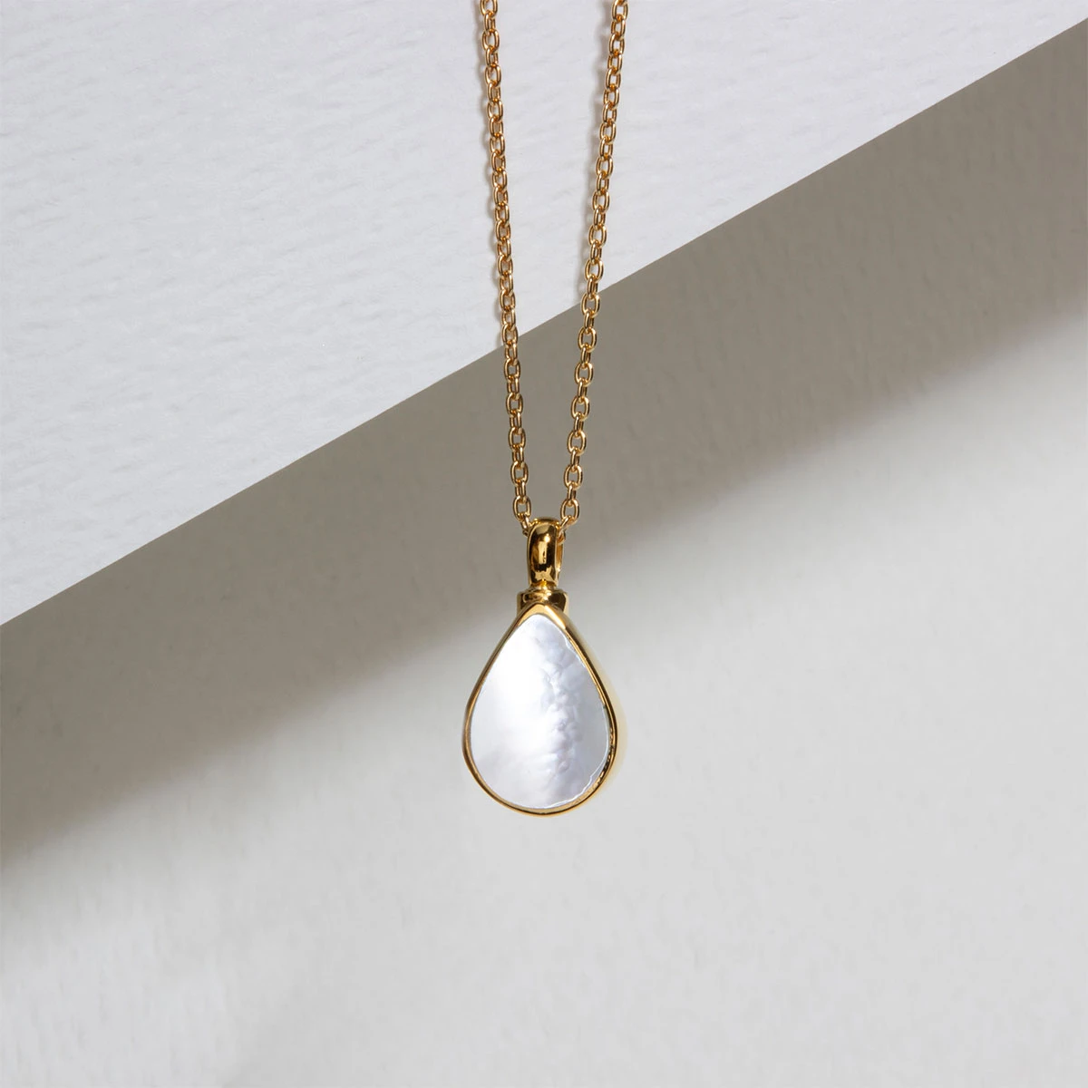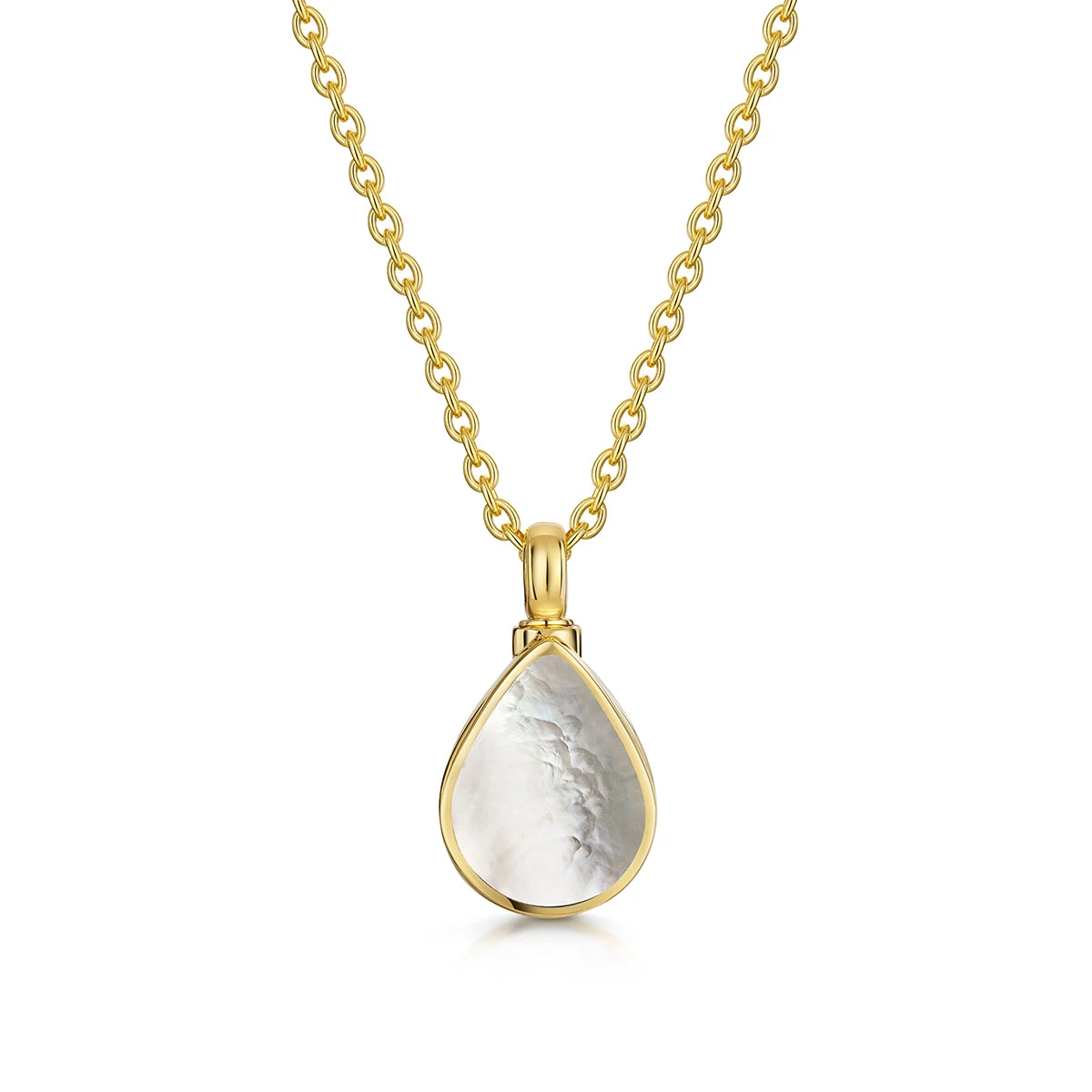 Crafted from 925 sterling silver and plated with 18K gold, this LOVELOX teardrop urn pendant and chain features mother of pearl, symbolising the everlasting bond of love and connection. Effortlessly access the discreet urn with its concealed screw-top mechanism – simply twist the bail until it opens. Complete with a convenient funnel and poker, insertion of precious ashes is an easy process.