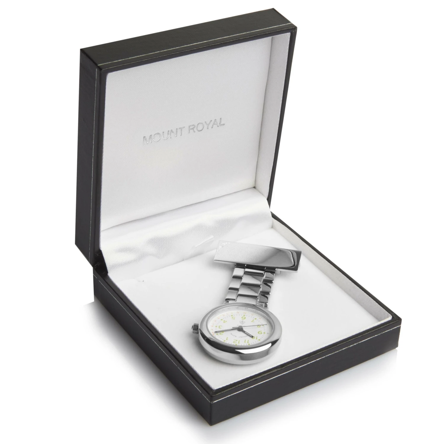 Luxury Mount Royal personalised nurses fob watch with polished chrome finish and luminous dial. This beautiful timepiece epitomises the classic style of the iconic nurses fob watch, combining exquisite aesthetics with enduring quality. The Quartz movement ensures precision timekeeping while the clean lines and a highly polished finish offer a distinguished poise.