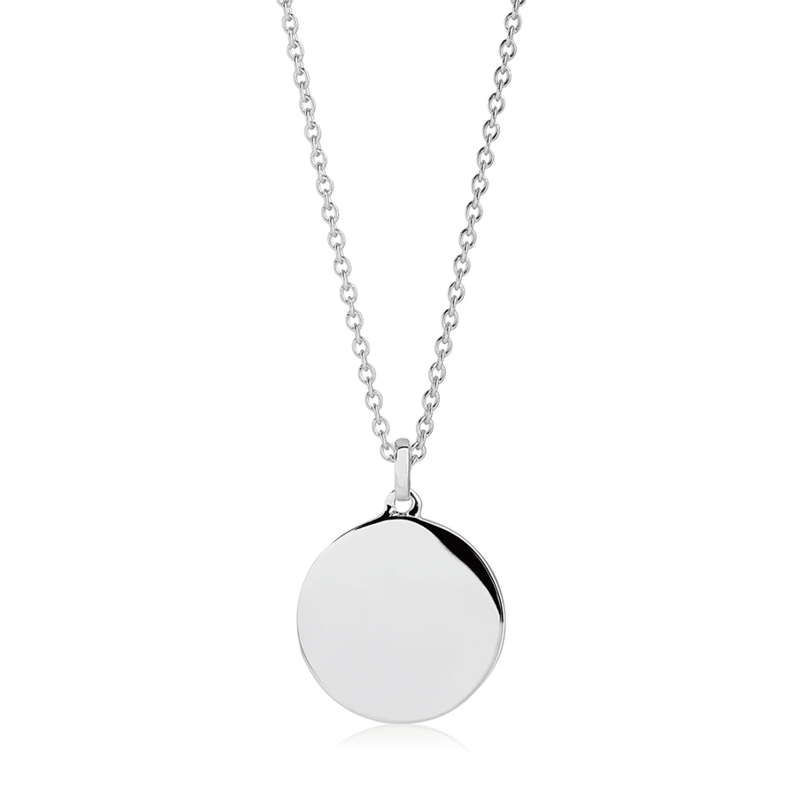 Classic disc pendant made of 925 Sterling silver with rhodium plating. A beautiful personalised necklace from the eponymous Scandinavian jewellery house. Sif Jakobs jewellery is award winning and recognised across Europe for its clean lines, poise and finish. This piece is pared back to its essential form and delights in its simplicity to create an evergreen piece which will be a favourite in any wardrobe. Personalised by Engravers Guild of London with the finest diamond-tipped cutter, this is a special gift which will always be treasured.