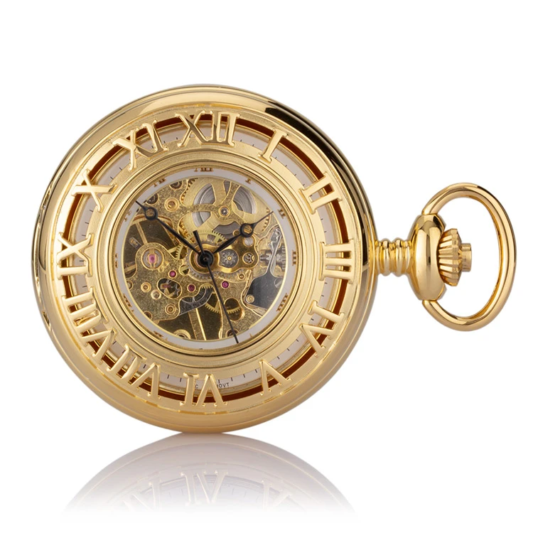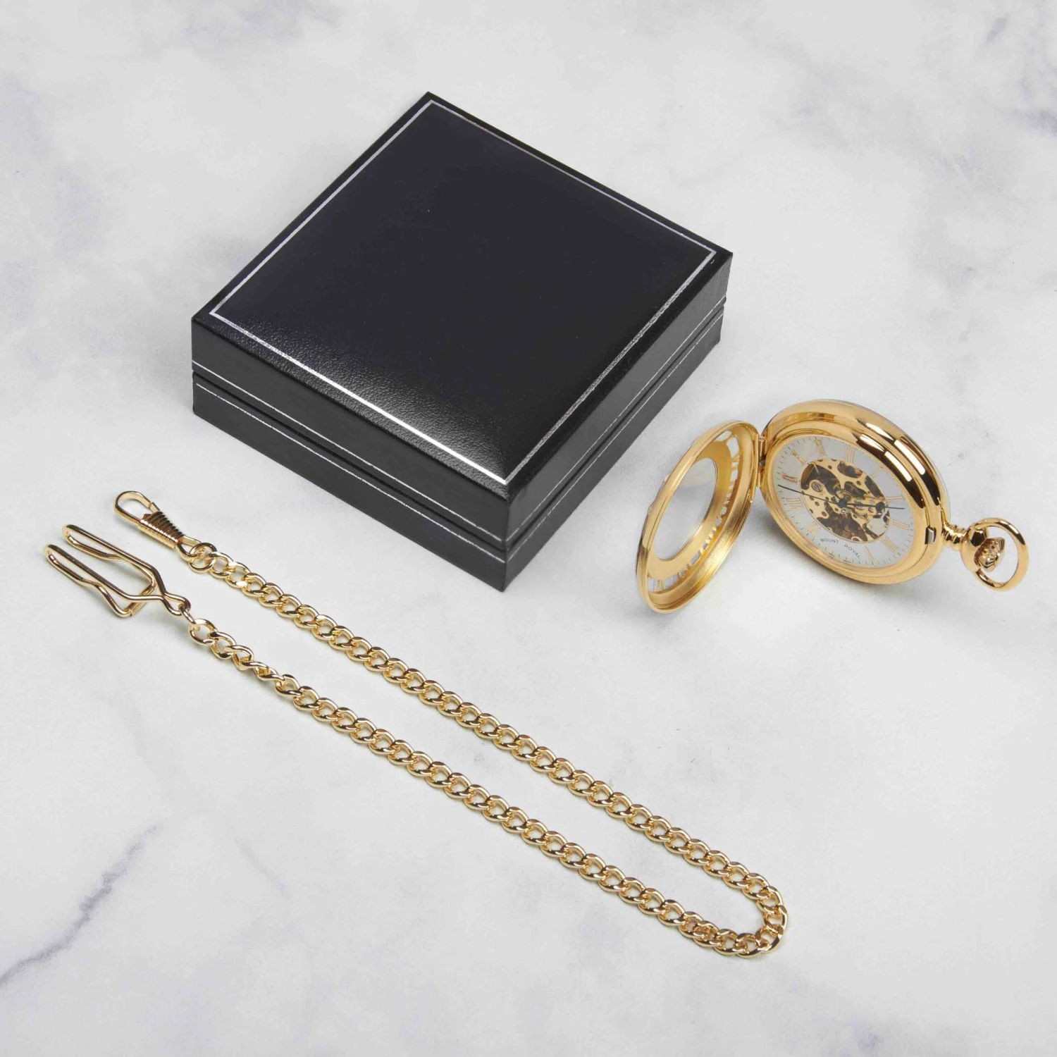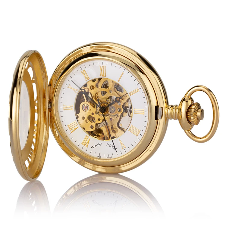 Gold plated single hunter skeleton pocket watch with mechanical movement from the Mount Royal collection. The striking detailing on the front case makes for a completely unique timepiece, showcasing the quality of this multi-faceted personalised pocket watch. The 17 jewel precision movement is displayed through the front case, while the reverse of the pocket watch is perfect for engraving with a solid case.