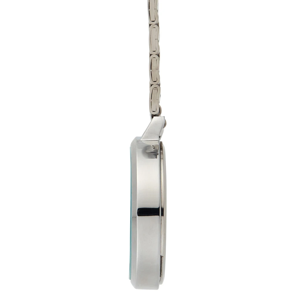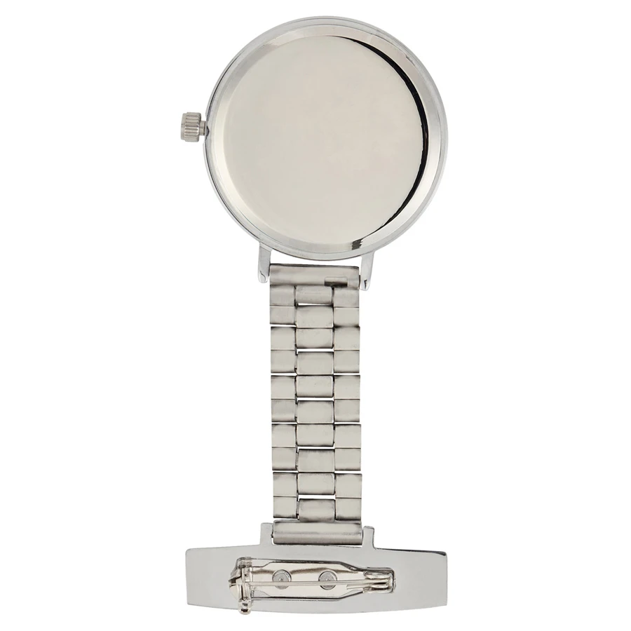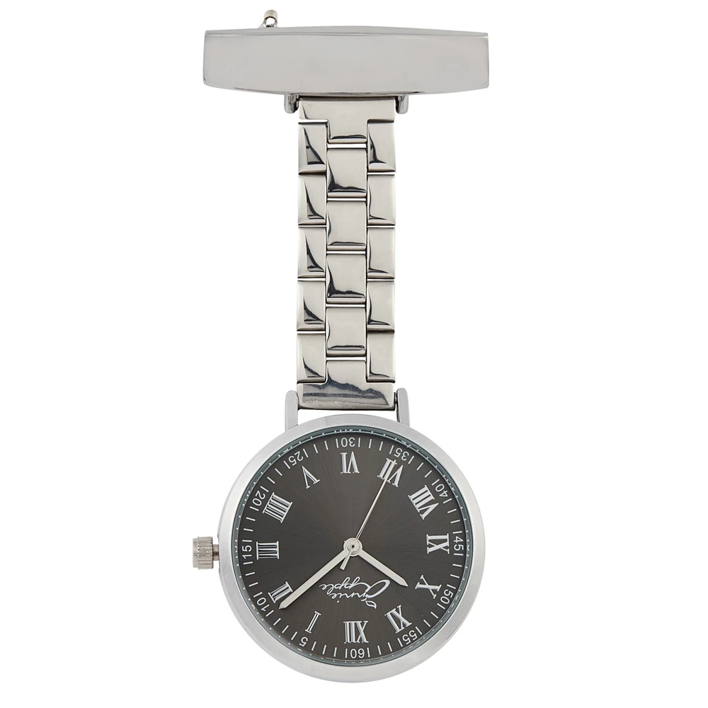Silver nurse fob watch from Annie Apple, featuring a black dial with silver Roman numerals. This contemporary timepiece is beautifully proportioned and is designed with both men and women in mind. The broad silver links in the strap offer a clean and timeless appearance which delivers an enduring style for any healthcare environment. Engraved with the finest quality diamond-tipped cutters, the personalised nurse watch is a beautiful gift which will leave a lasting impression.