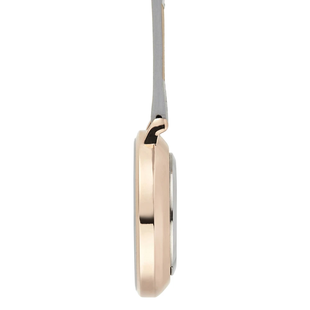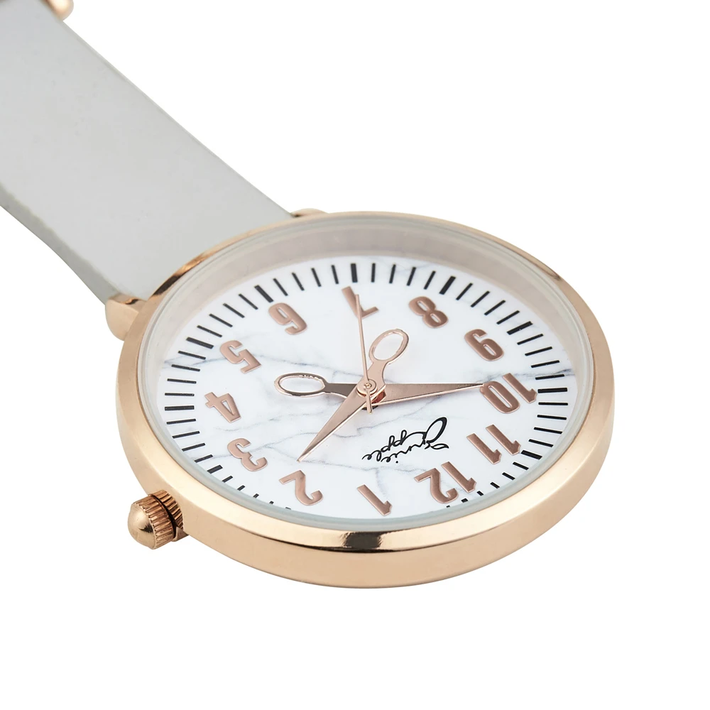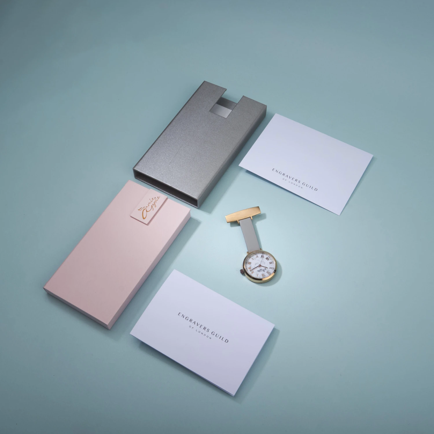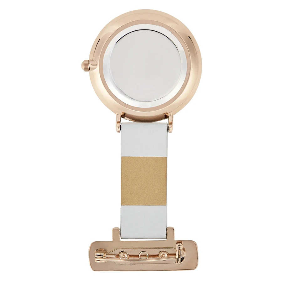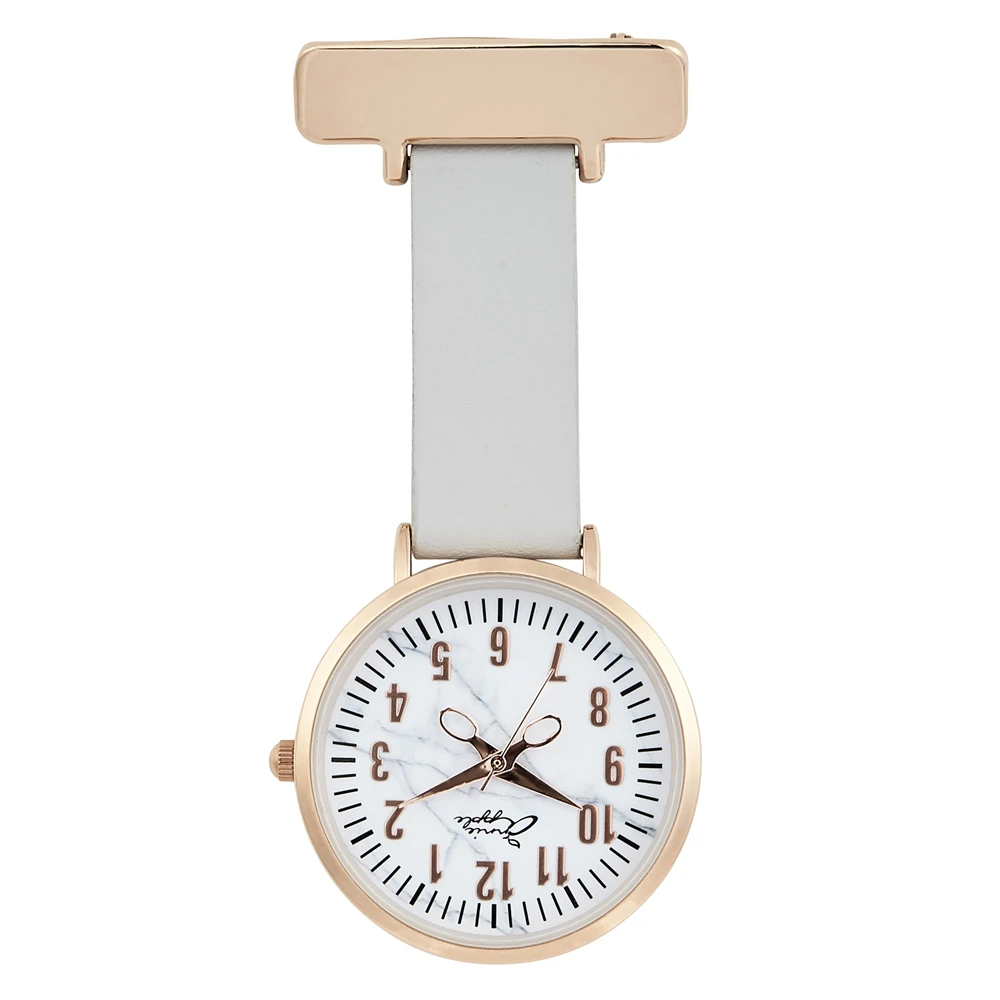 Rose gold nurse fob watch from Annie Apple with stone leather strap. This nurse watch features thoroughly contemporary styling, showcasing a marble-effect dial, rose gold case and Arabic numerals, as well as a supple leather strap. Designed with young healthcare workers in mind, it brings out a sense of fun that can be enjoyed by anyone who enjoys expressing a unique style and is young at heart. The engraving is made with the finest quality diamond-tipped cutter to create a beautiful gift.