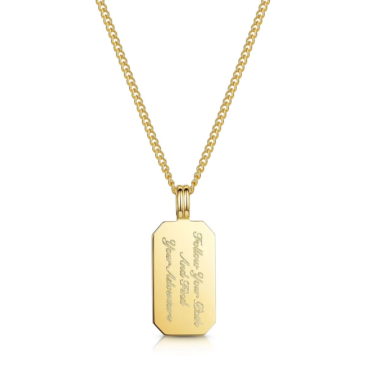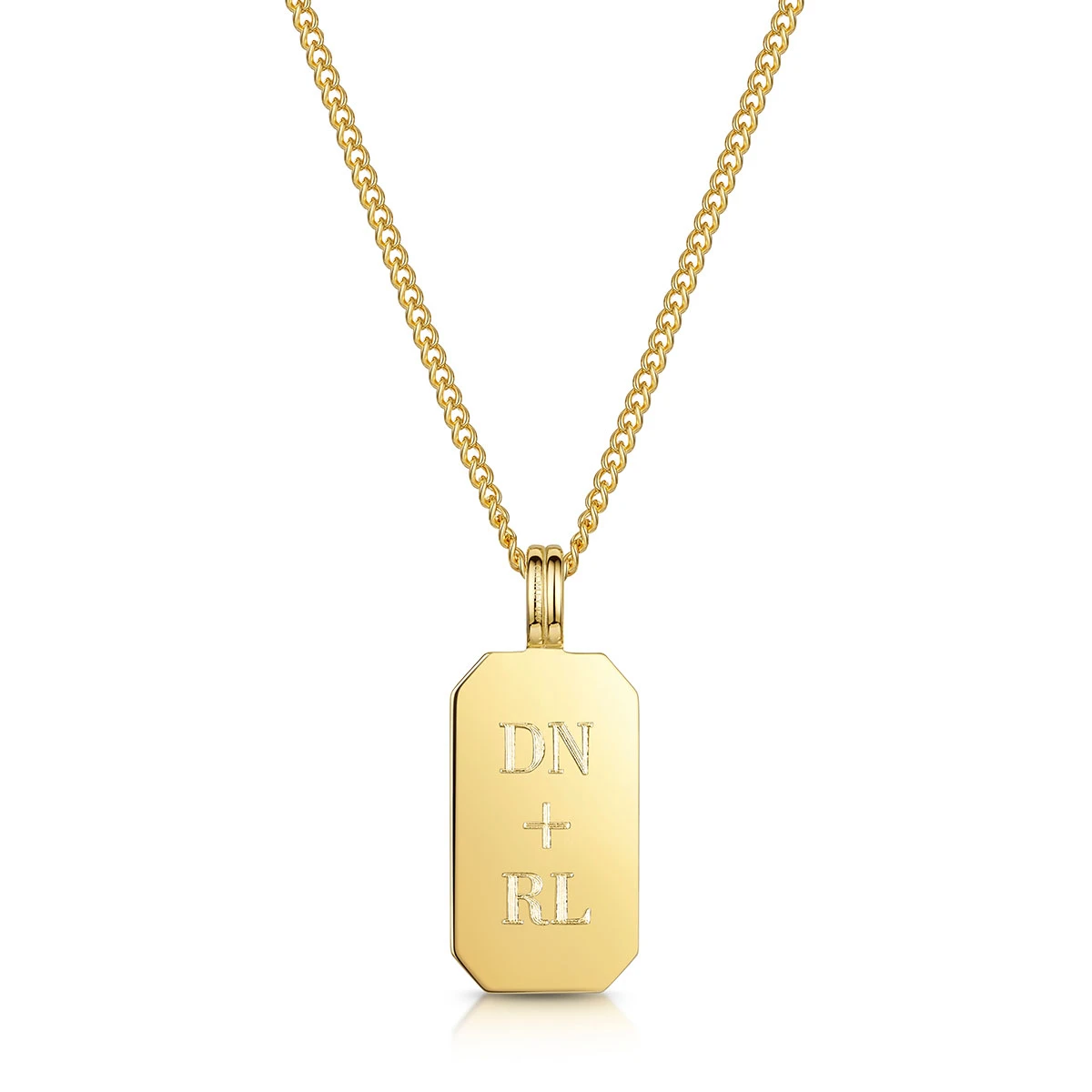 A minimal statement piece for the modern gentleman, the Octagonal Dog Tag and chain from Clewley are crafted from 925 sterling silver plated with 18K gold. This octagonal-shaped pendant boasts clean edges, a highly polished finish, and a signature double bail.
