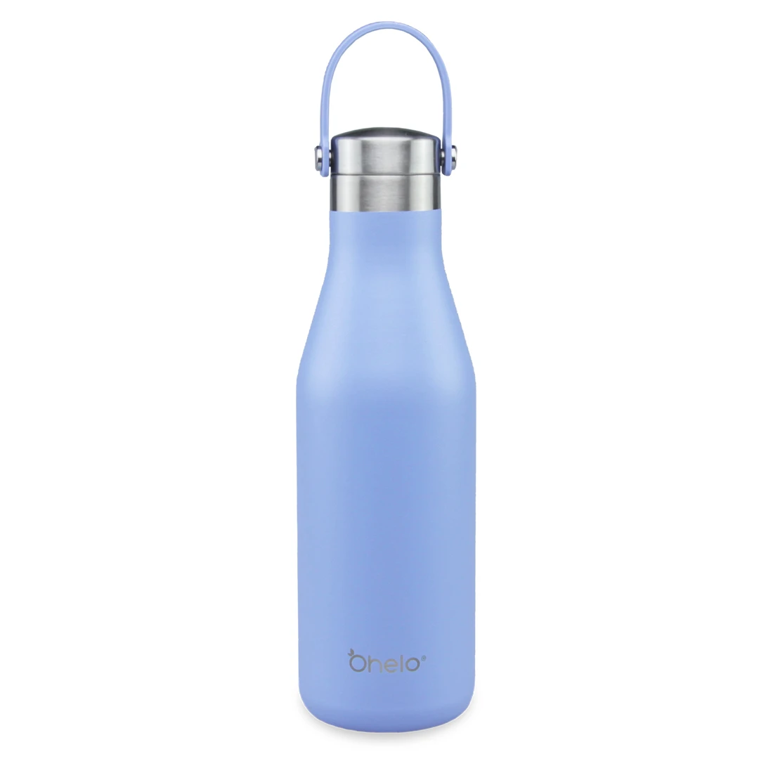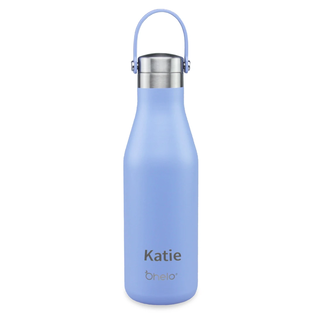 Personalised drinks bottle in the colour Blue from Ohelo. Ethically produced, this sustainable reusable bottle has double wall insulation, with copper lining to enhance thermal insulation along with a leak proof cap. This bottle also features a powder coat finish providing a chip resistant, slip resistant high end finish and is free from BPA, BPF and BPS. It fits standard ice cubes and keeps contents cold for 24 hours, whilst also keeping warm contents hot for 12 hours.