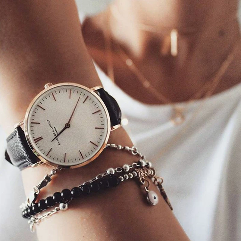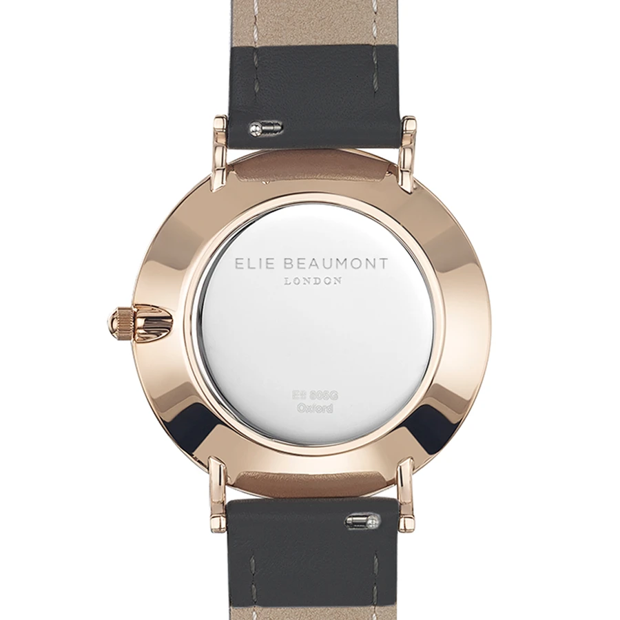 Engraved ladies watch from Elie Beaumont in rose gold with black leather strap. A delectably sized watch full of minimalist charm. Featuring a perfectly balanced 33mm case with a precision Japanese Miyota movement, the dial is protected by hardened mineral glass that provides water resistance to 3 atmospheres. Delivered in Elie Beaumont signature packaging with a contemporary grey leather cover, the watch delivers a feminine and stylish gift experience.