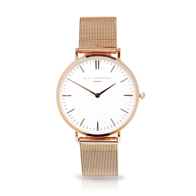 Engraved ladies watch from Elie Beaumont in rose gold with mesh strap and white eggshell dial. A delectably sized watch full of minimalist charm. Featuring a perfectly balanced 33mm case with a precision Japanese Miyota movement, the dial is protected by hardened mineral glass that provides water resistance to 3 atmospheres. Delivered in Elie Beaumont signature packaging with a contemporary grey leather cover, the watch delivers a feminine and stylish gift experience.