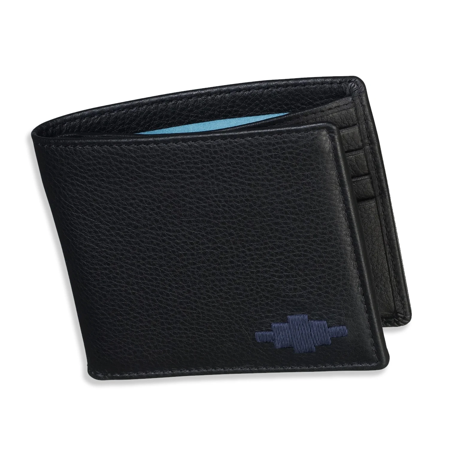 Black leather personalised wallet from Pampeano, embossed by Engravers Guild of London with either gold foil, silver foil or blind. This card wallet is perfect for those who prefer not to store change in their wallet. This streamlined piece features 8 credit card slots inside and two full length slip pockets for keeping notes and receipts organised. Discreet slip pockets are also present behind the card slots to keep important documents secure and out of site. Each of the pockets have been lined with the most luxuriously soft suede, in an eye-catching Bandera blue colour, which beautifully contrasts against the navy leather.