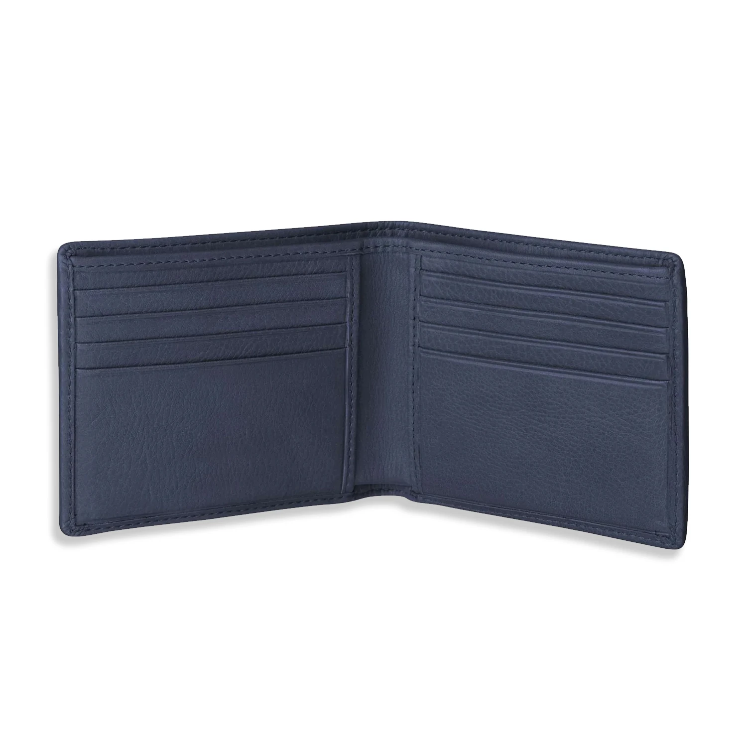 Navy leather personalised wallet from Pampeano, embossed by Engravers Guild of London with either gold foil, silver foil or blind. This card wallet is perfect for those who prefer not to store change in their wallet. This streamlined piece features 8 credit card slots inside and two full length slip pockets for keeping notes and receipts organised. Discreet slip pockets are also present behind the card slots to keep important documents secure and out of site. Each of the pockets have been lined with the most luxuriously soft suede, in an eye-catching Bandera blue colour, which beautifully contrasts against the navy leather.