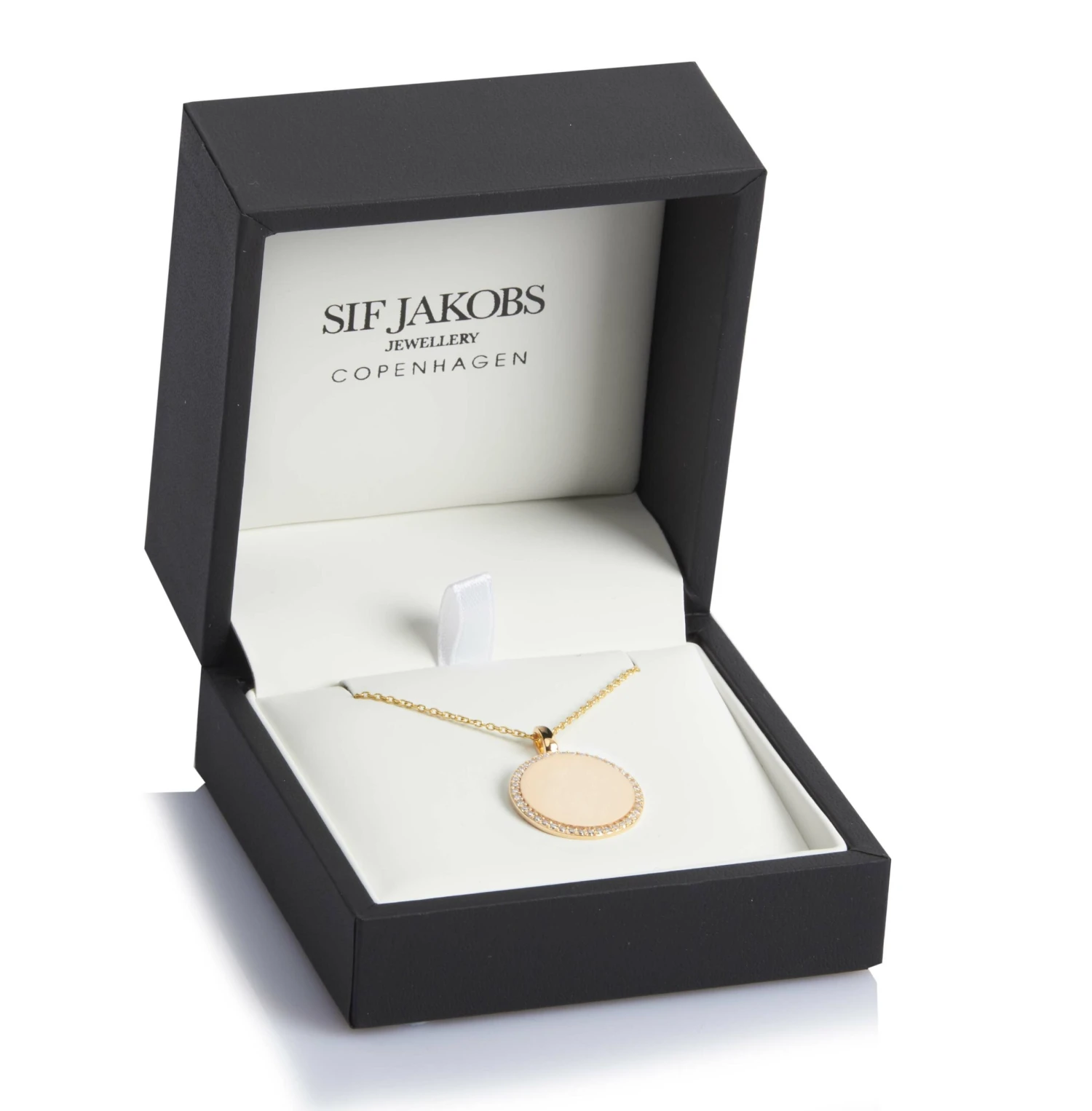 This beautiful pendant is made of 925 Sterling silver and plated in 18K gold, with a polished surface and facet cut white zirconia. Sif Jakobs jewellery is award winning and recognised across Europe for its clean lines, poise and finish. Personalised by Engravers Guild of London with the finest diamond-tipped cutter, this is a special gift which will always be treasured.