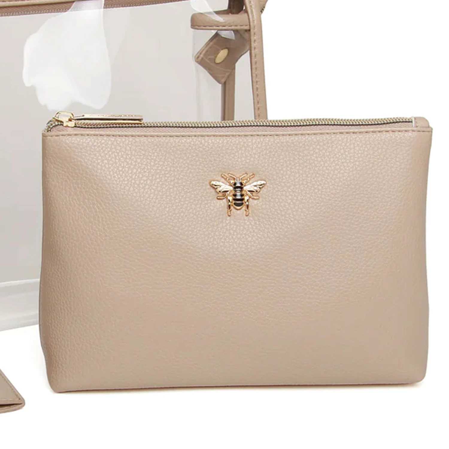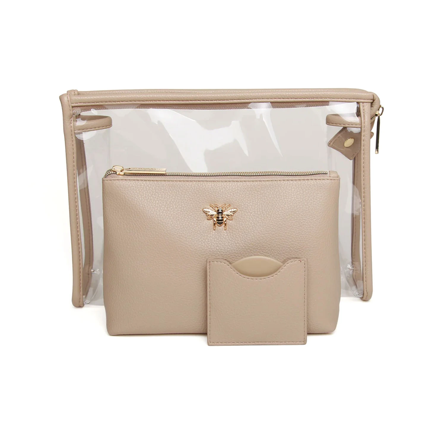 The ultimate luxury stone colour make up travel set by Alice Wheeler London. This amazing three-piece set includes a clear PVC makeup and travel case, a luxury textured vegan leather beauty bag, and a beautiful round compact mirror in a matching vegan leather pouch. This personalised 3 piece set features gold toned hardware is finished with a gold metal honey bee. Engravers Guild will emboss the recipient’s initials to make this bag extra special.