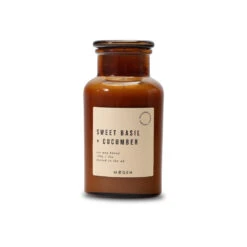 A 100% sustainable soy wax candle with a British made fragrance of sweet basil and cucumber. Top notes of lime and lemongrass with a heart of cooling cucumber and herbal basil throughout. Make this candle the perfect gift for any occasion, with a personal message engraved on the reverse of the vessel. Precision laser engraving creates a beautiful impression. This candle is designed and poured in the UK, with an old-style alchemist jar that can be repurposed once the candle is used.