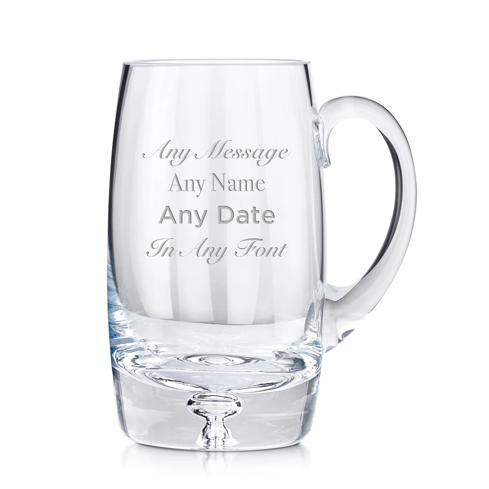 A traditionally shaped personalised pint tankard with a modern twist. Beautiful curved edges and a rising bubble in the base distinguish this tankard as a unique piece of glassware. The bubble is mouth-blown, while the shape and handle of the tankard hare hand crafted. Designed to last a lifetime, this beer glass feels strong in the hand and can equally be used for presentation purposes.