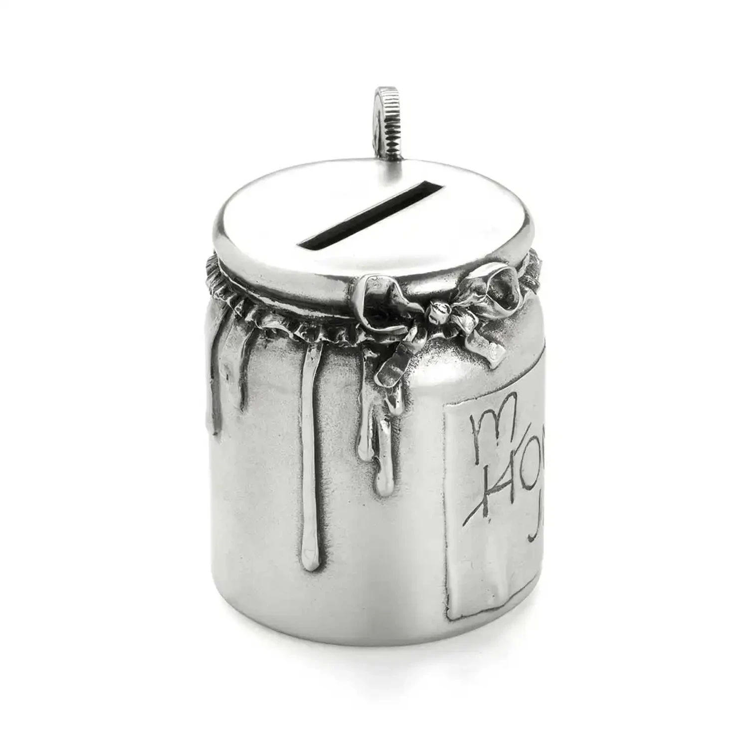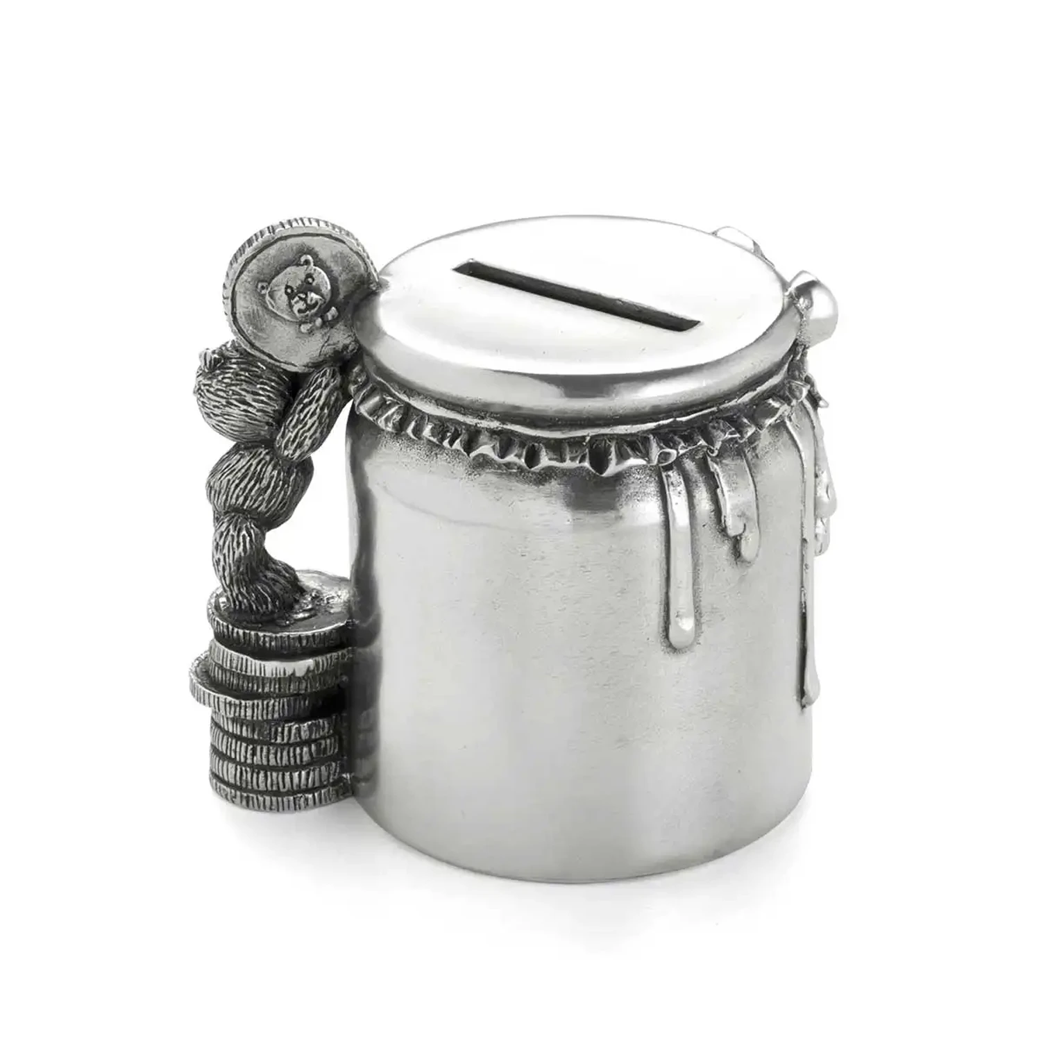 Personalised pewter money box from Royal Selangor. An adorable keepsake money box crafted from pewter. Having requisitioned the honey jar and, in an inspired (or perhaps fortuitous) stroke, repurposed the jar’s label, teddy now discovers he may have bitten off more than he can chew!