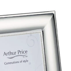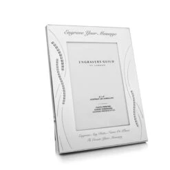 A glamorous silver plated keepsake frame to fit a portrait 4×6 printed photo. This silver plated frame is embellished with a waved crystal design around the photograph insert. Including your chosen printed photo and personalised using precision engraving cuts, this gift is beautifully unique to everyone. This frame is completed with a standing strut.