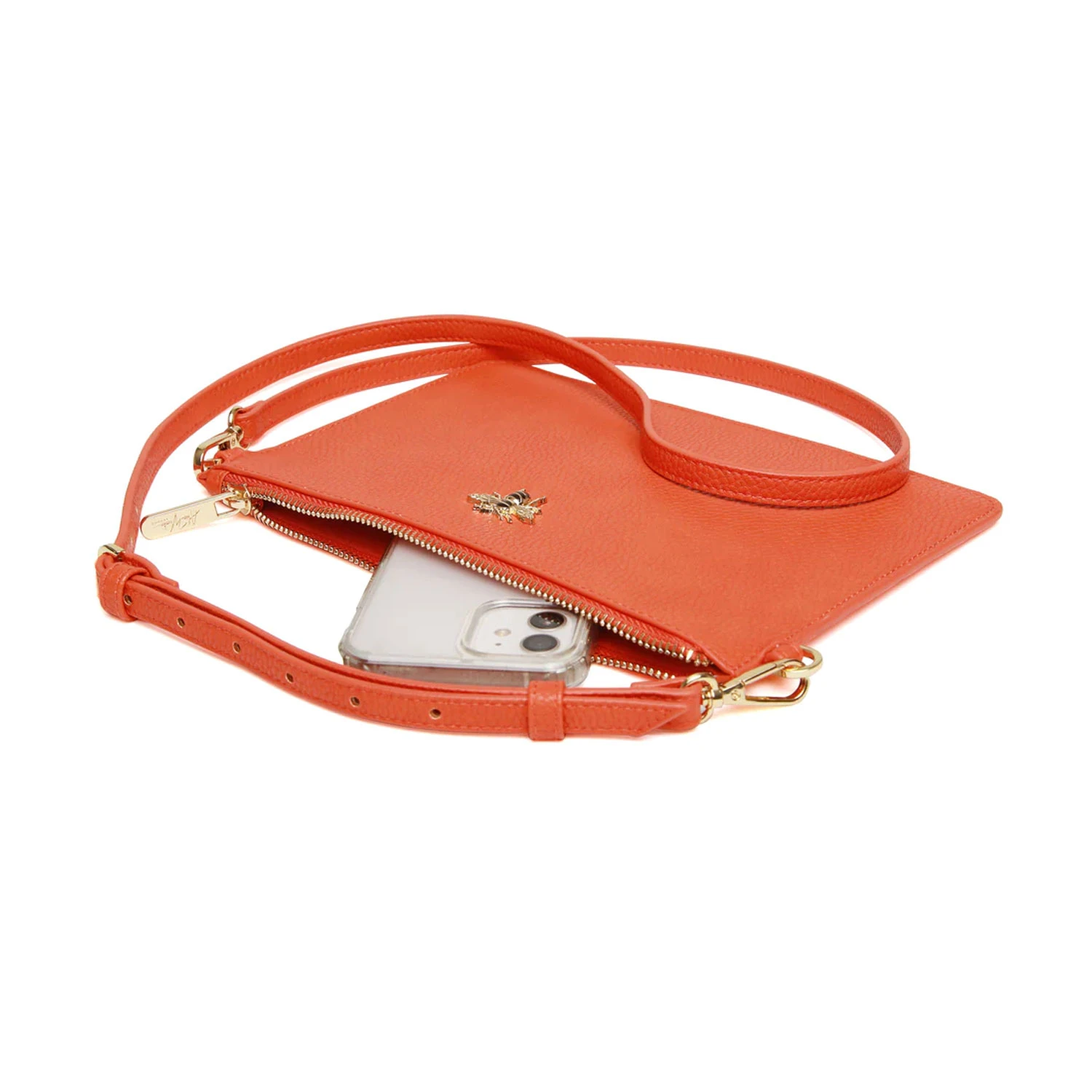 A versatile clutch bag in orange, made with vegan leather by Alice Wheeler. This personalised bag is designed for hands free convenience. Featuring adjustable cross body straps that can be removed, and furnished using gold metal toned clasps, Alice Wheeler signature bee and a pull & zip fastening, revealing a deceptively spacious compartment. Engravers Guild will emboss the recipient’s initials to make this bag extra special.