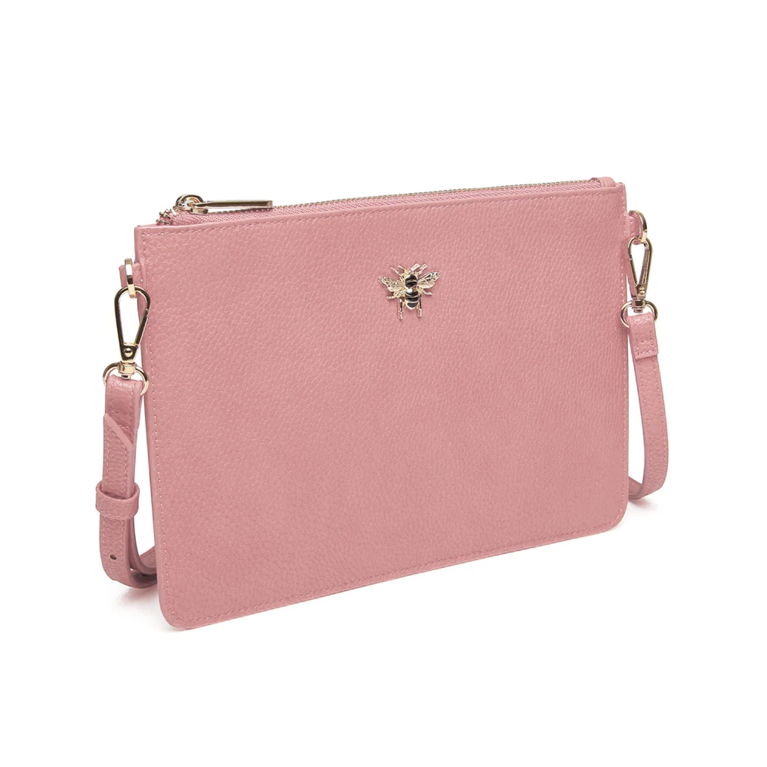 A versatile clutch bag in pink, made with vegan leather by Alice Wheeler. This personalised bag is designed for hands free convenience. Featuring adjustable cross body straps that can be removed, and furnished using gold metal toned clasps, Alice Wheeler signature bee and a pull & zip fastening, revealing a deceptively spacious compartment. Engravers Guild will emboss the recipient’s initials to make this bag extra special.