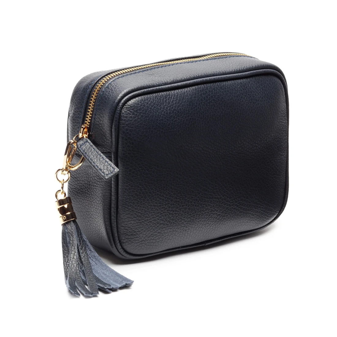A genuine leather crossbody handbag, in the colour navy. This personalised bag is perfect for any occasion, day or night. Hand-finished and made from premium grained genuine leather by artisans in Italy, this bag features subtle gold fittings and a matching leather tassel. This crossbody also has a double layer reinforced base and includes both a matching slim leather strap and a blue diamond patterned strap. Fully adjustable, they are worn crossbody or over the shoulder as your mood takes you. The perfect size for your phone, cards, keys, make-up and other essentials, this bag comes fully lined with an internal zipped change pocket and additional mobile phone pocket. Engravers Guild will emboss the recipient’s initials to make this bag extra special.