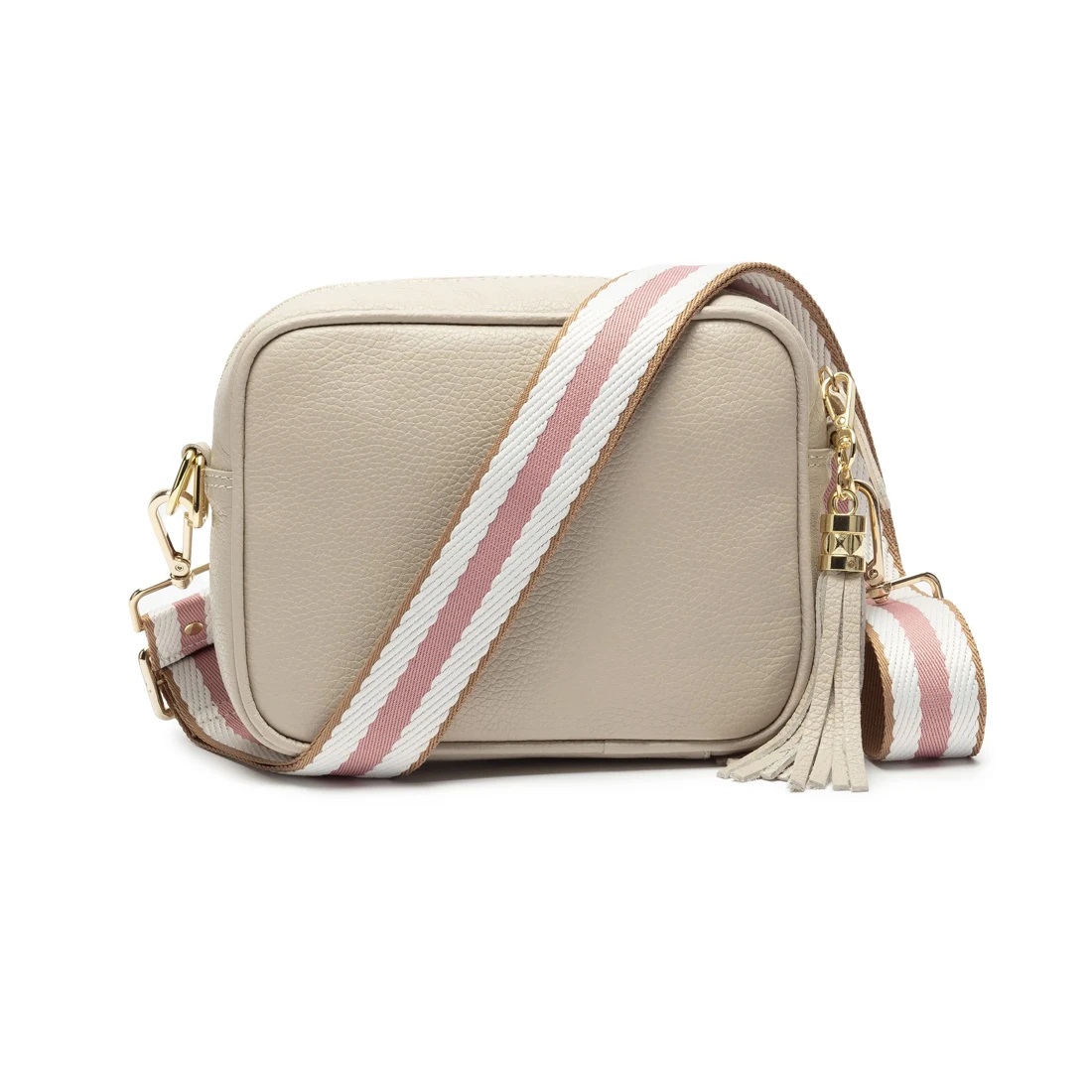 A genuine leather crossbody handbag, in the colour stone. This personalised bag is perfect for any occasion, day or night. Hand-finished and made from premium grained genuine leather by artisans in Italy, this bag features subtle gold fittings and a matching leather tassel. This crossbody also has a double layer reinforced base and includes both a matching slim leather strap and a biscuit patterned strap. Fully adjustable, they are worn crossbody or over the shoulder as your mood takes you. The perfect size for your phone, cards, keys, make-up and other essentials, this bag comes fully lined with an internal zipped change pocket and additional mobile phone pocket. Engravers Guild will emboss the recipient’s initials to make this bag extra special.