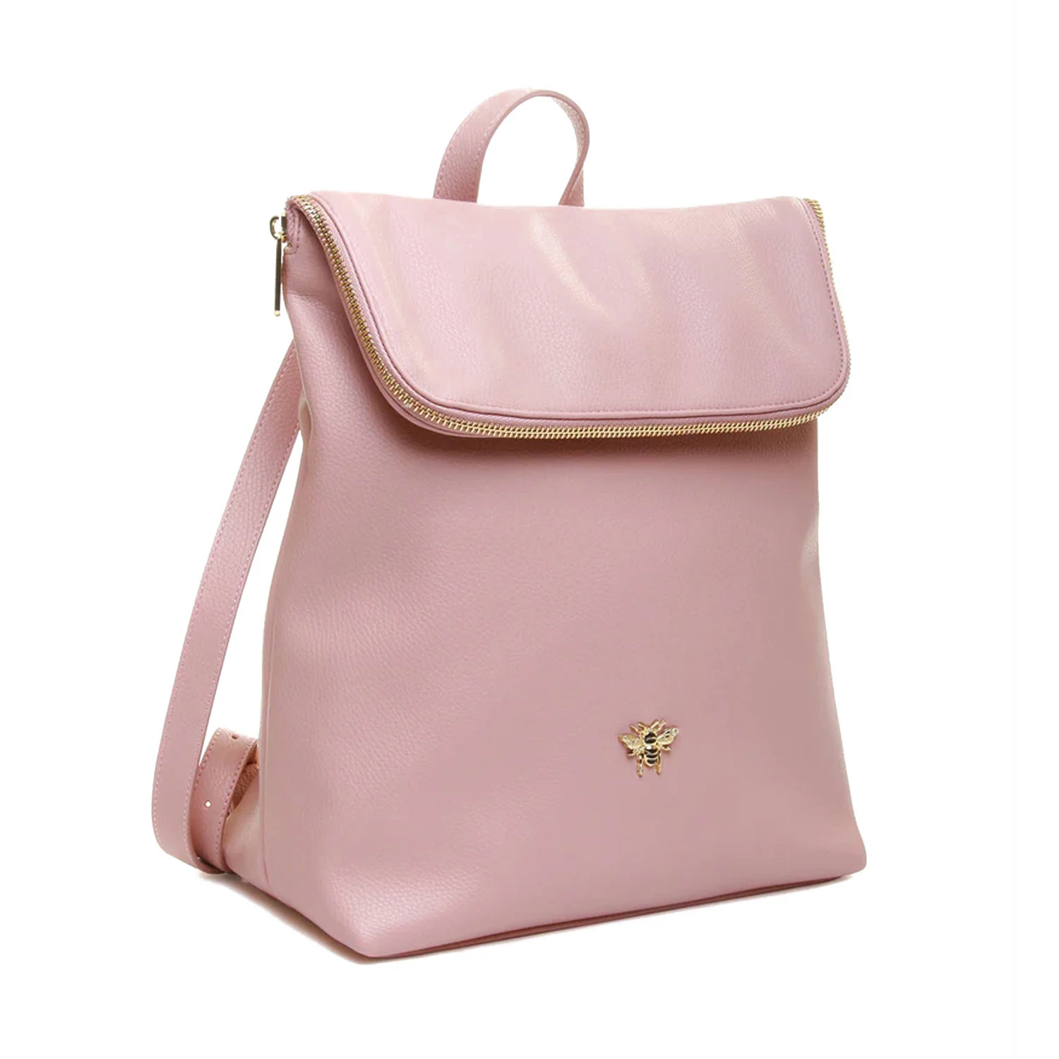 A spacious contemporary backpack in a light pink colour. This personalised bag is perfect for travelling or students and features a fully lined compartment secure with zip fastening and a handy internal zipped pocket to keep cards and small valuables safe and secure. Each bag is crafted from vegan leather with gold toned hardware and Alice Wheeler’s signature gold bee emblem. Engravers Guild will emboss the recipient’s initials to make this bag extra special.