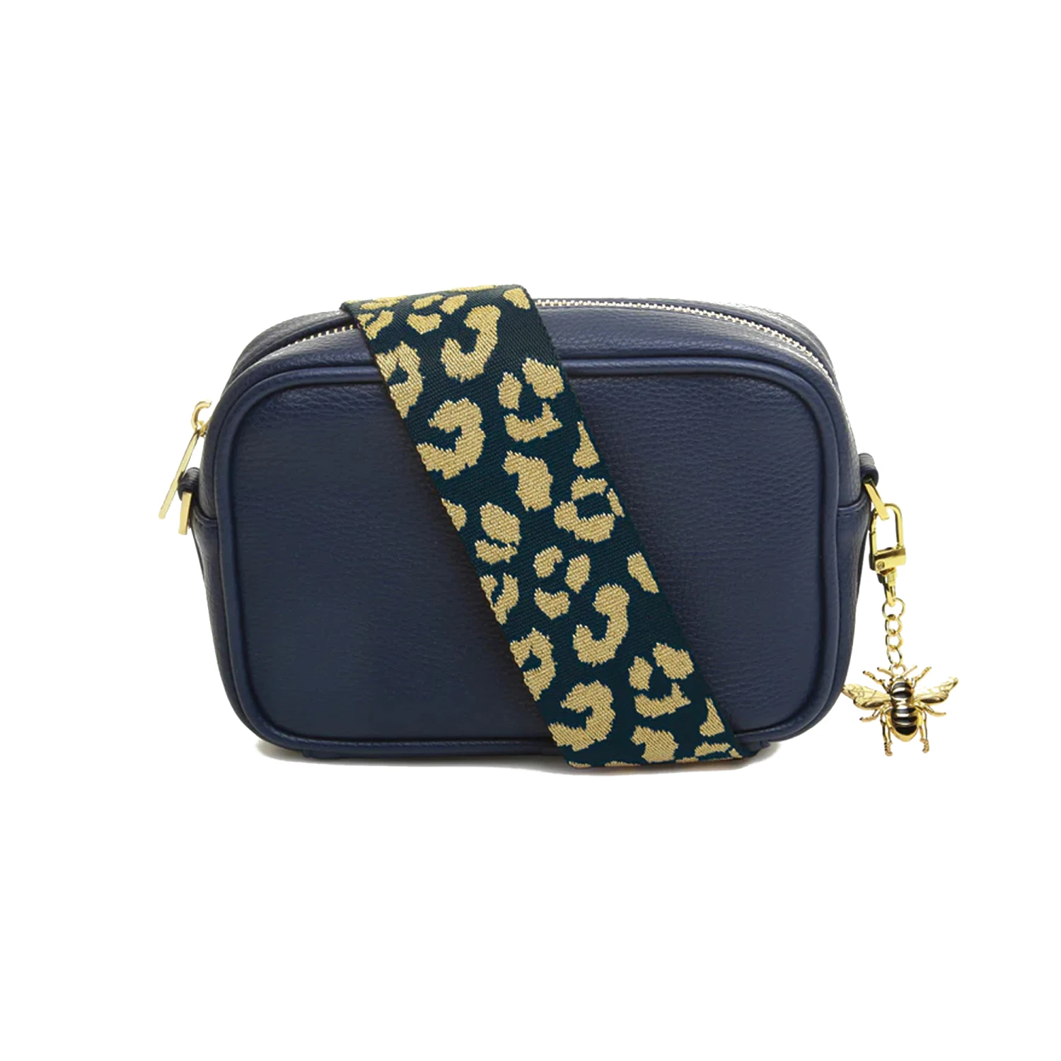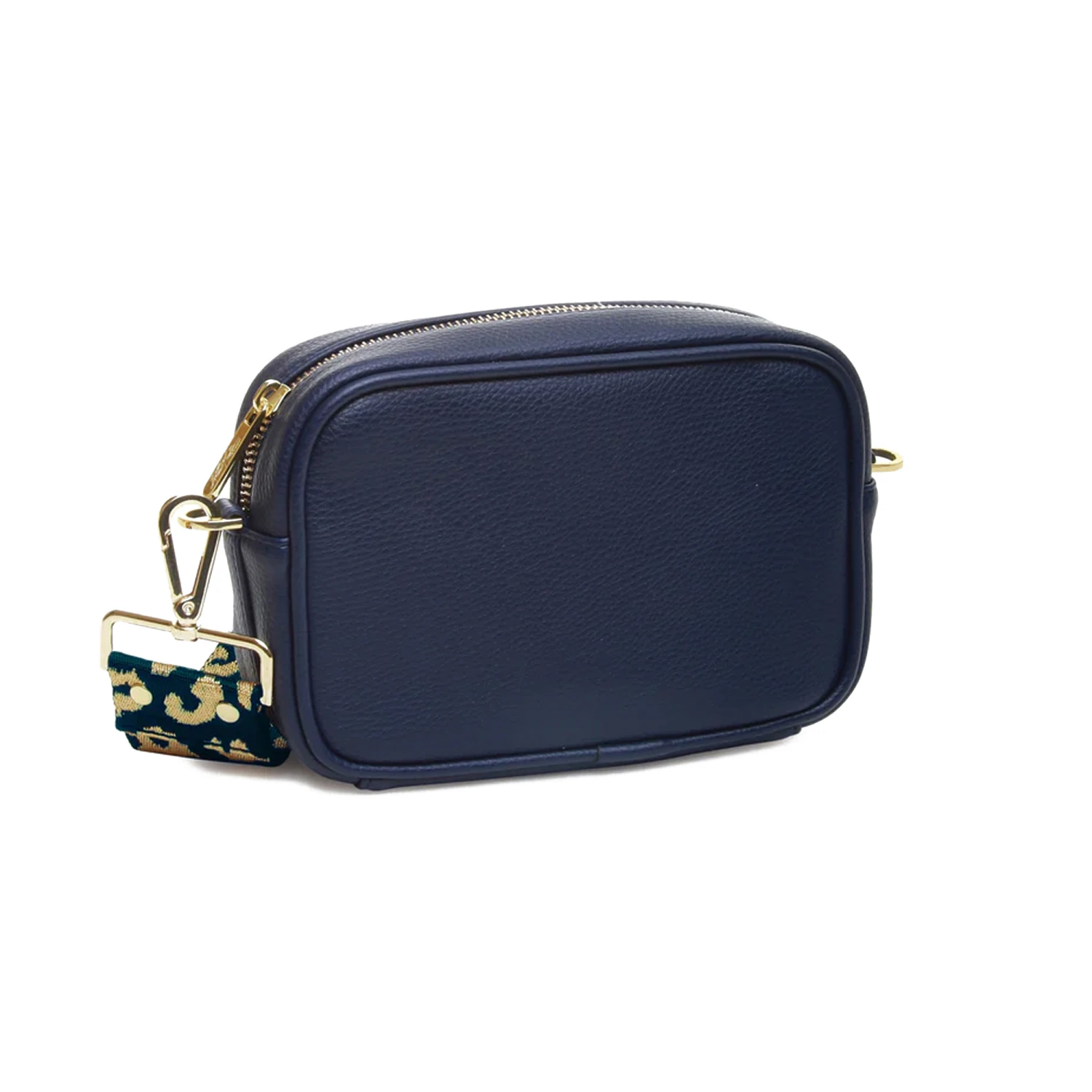 A mini crossbody bag in a sophisticated navy colour. This personalised bag is effortlessly practical, perfect for any occasion. Crafted in fine vegan leather with textured print detail, the bag includes a super stylish woven printed interchangeable strap. The bag has a fully lined compartment, deceptively spacious, and secured with a metal zip fastener and embossed zip pull. Engravers Guild will emboss the recipient’s initials to make this bag extra special.