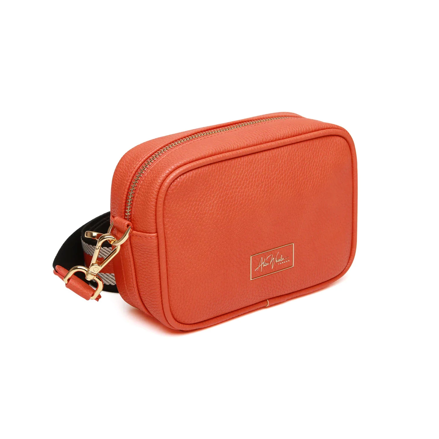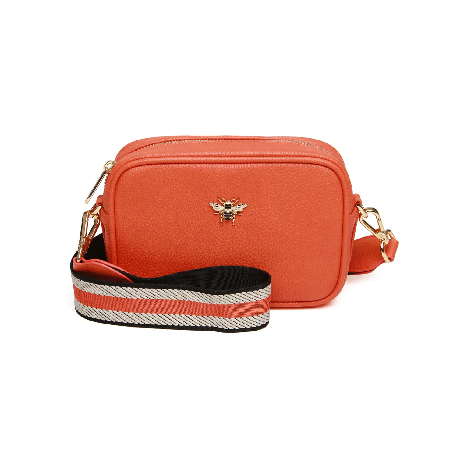 A mini crossbody bag in a striking orange colour. This personalised bag is effortlessly practical, perfect for any occasion. Crafted in fine vegan leather with textured print detail, the bag includes a super stylish woven printed interchangeable strap. The bag has a fully lined compartment, deceptively spacious, and secured with a metal zip fastener and embossed Zip pull. Engravers Guild will emboss the recipient’s initials to make this bag extra special.