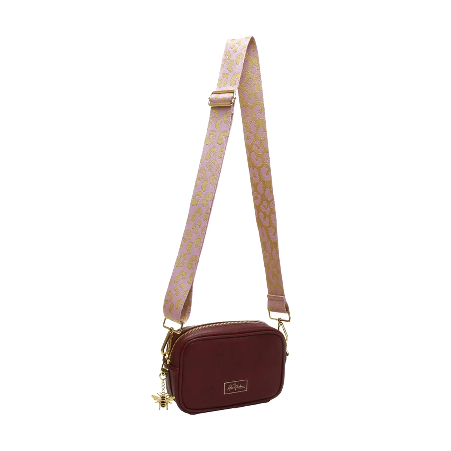 A mini crossbody bag in an autumnal plum colour. This personalised bag is effortlessly practical, perfect for any occasion. Crafted in fine vegan leather with textured print detail, the bag includes a super stylish woven printed interchangeable strap. The bag has a fully lined compartment, deceptively spacious, and secured with a metal zip fastener and embossed Zip pull. Engravers Guild will emboss the recipient’s initials to make this bag extra special.