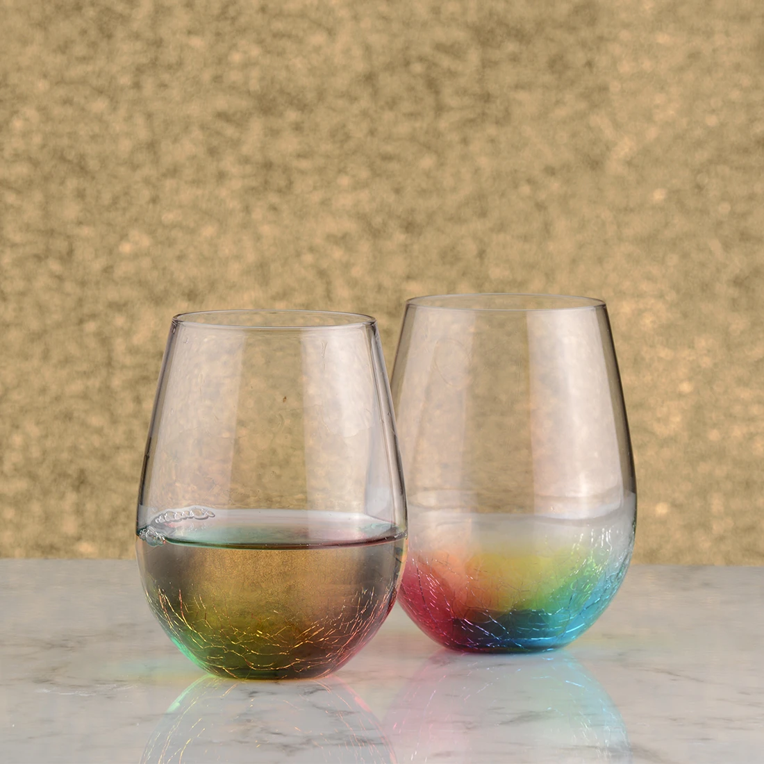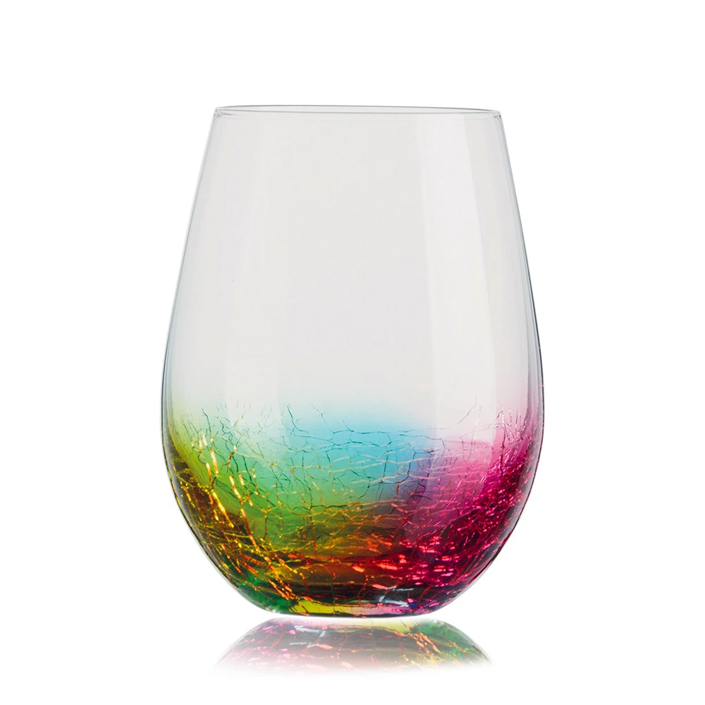 Round tumbler glass with a unique crackle of bright colours, presented in silk-lined presentation packaging. This glass is great as a whisky glass, stemless wine glass or for short cocktails making it a perfect gift for those who love a tipple. The bottom of every bowl is decorated with three different colours, each electric hue taking up a third, and seamlessly changing from one to the next. Add a personalised message of your choice to make it extra special. Precision laser engraving cuts a beautiful impression making the gift personal.