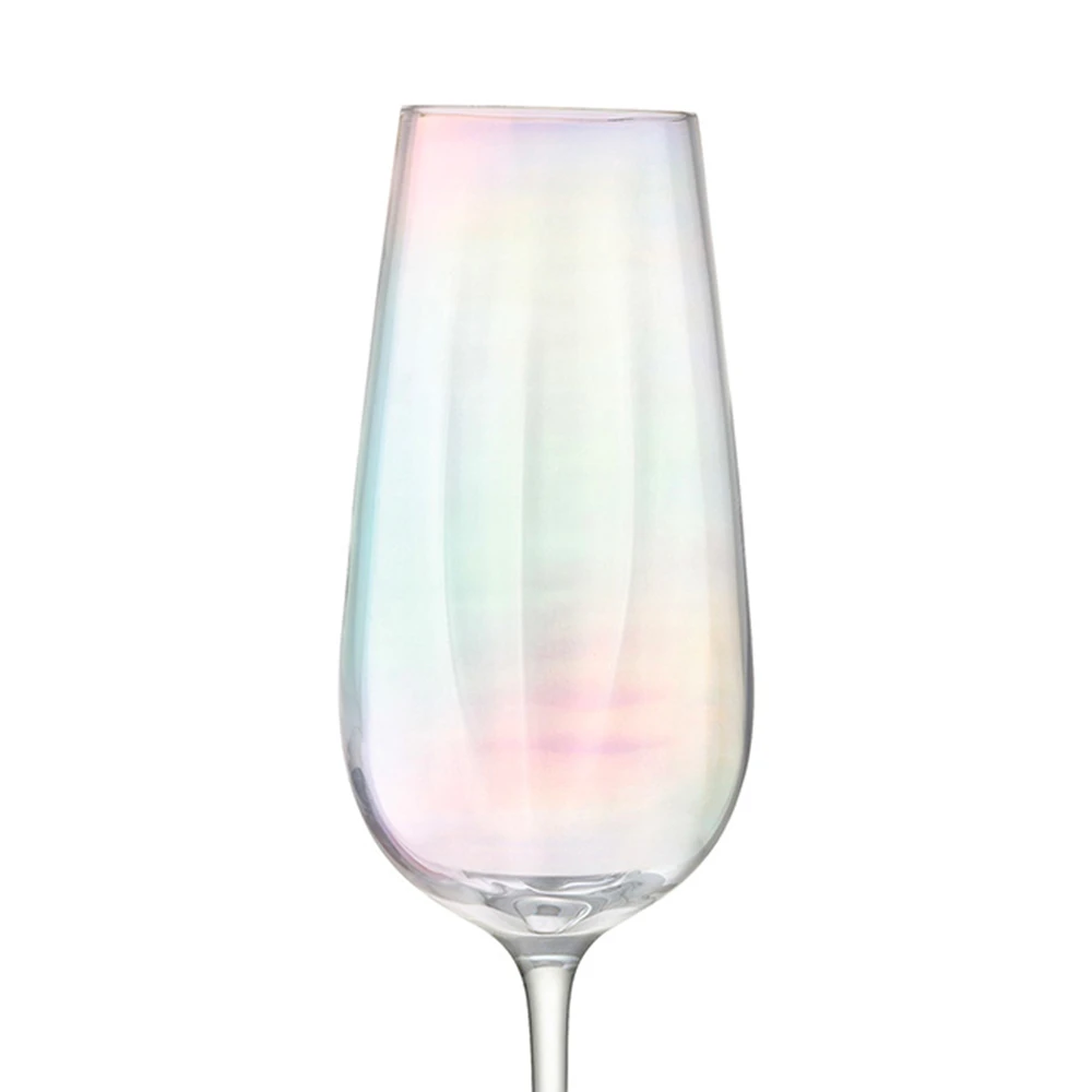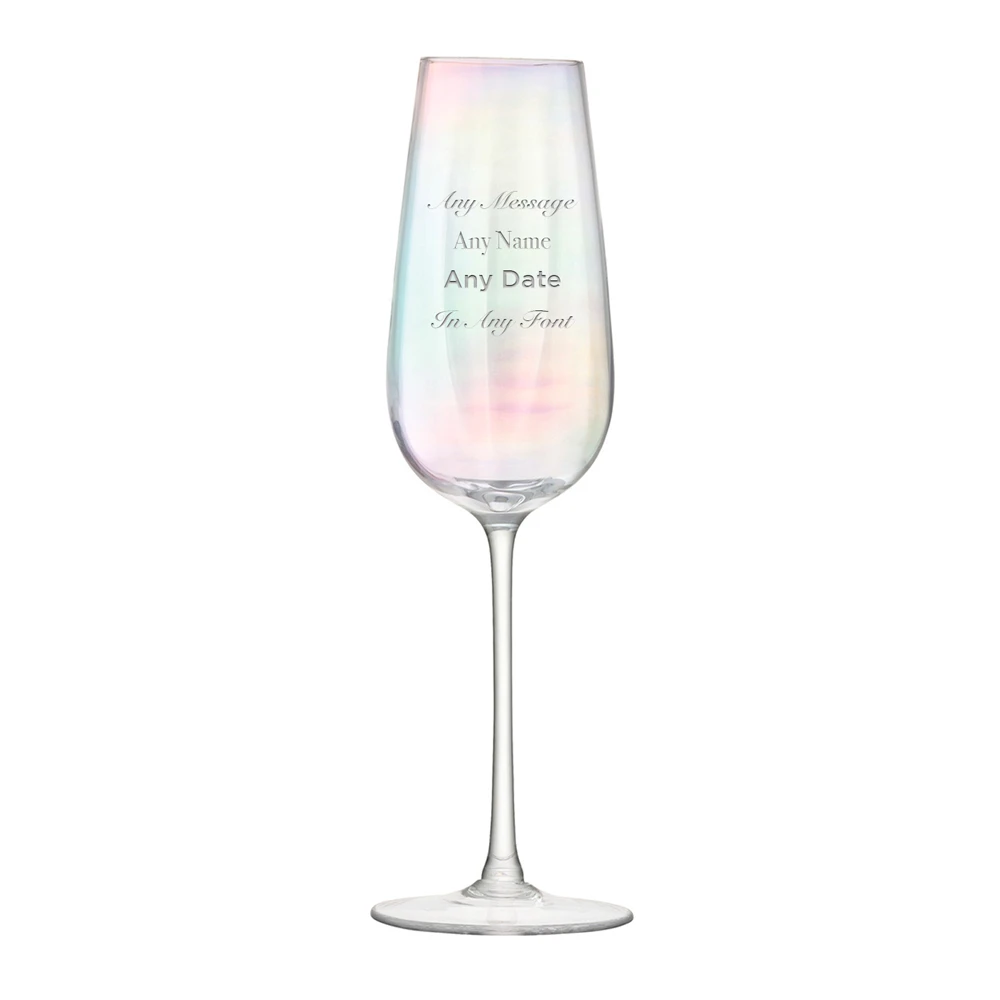 A personalised glass flute for champagne and prosecco, finished with an iridescent pearl effect. This stunning glass is a perfect gift for the modern sparkling wine drinker, great for regular use or as decorative tableware. These are mouth-blown flute glasses, hand painted with iridescent lustre. The bowls have a subtly-fluted texture which fades towards the rim. Add a personalised message of your choice to make it extra special with precision laser engraving.