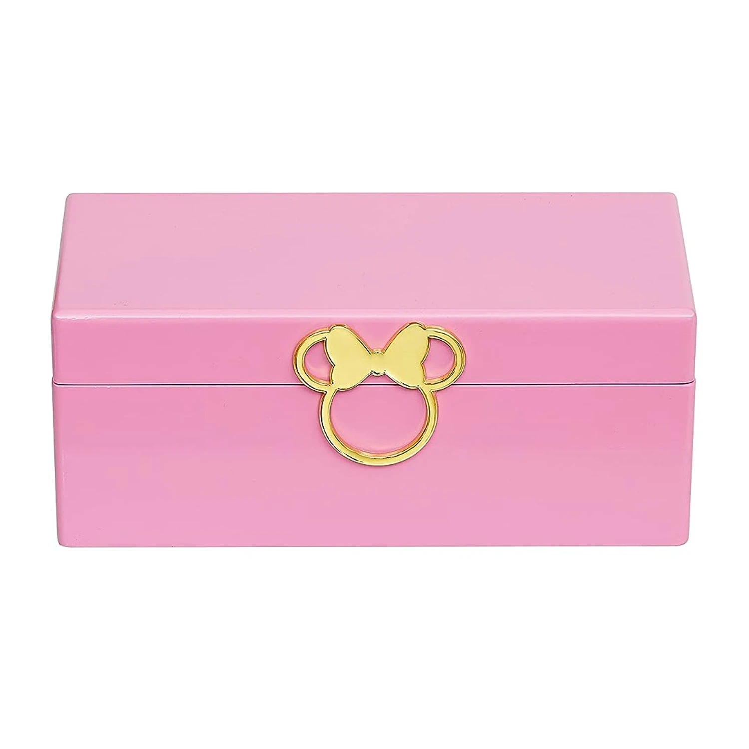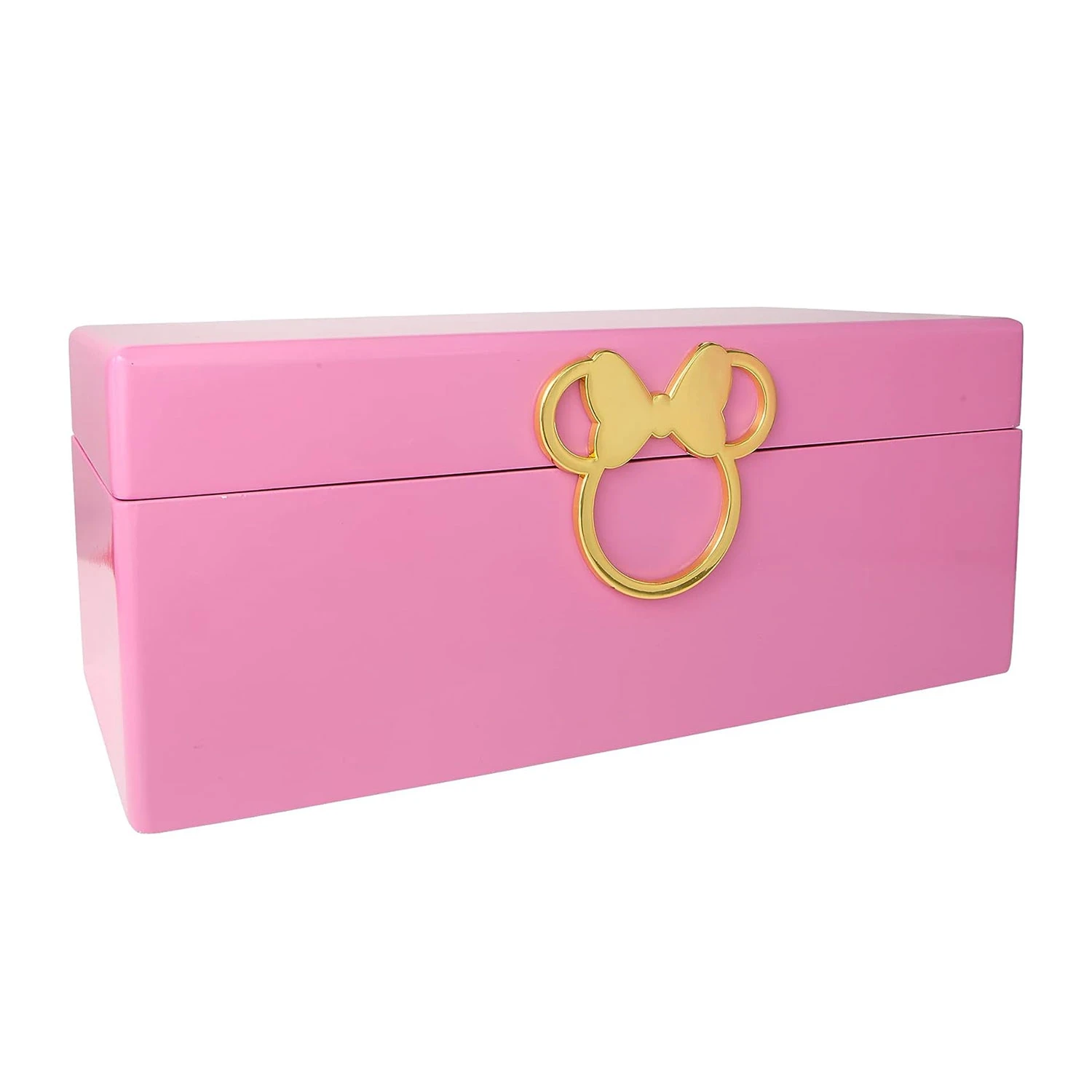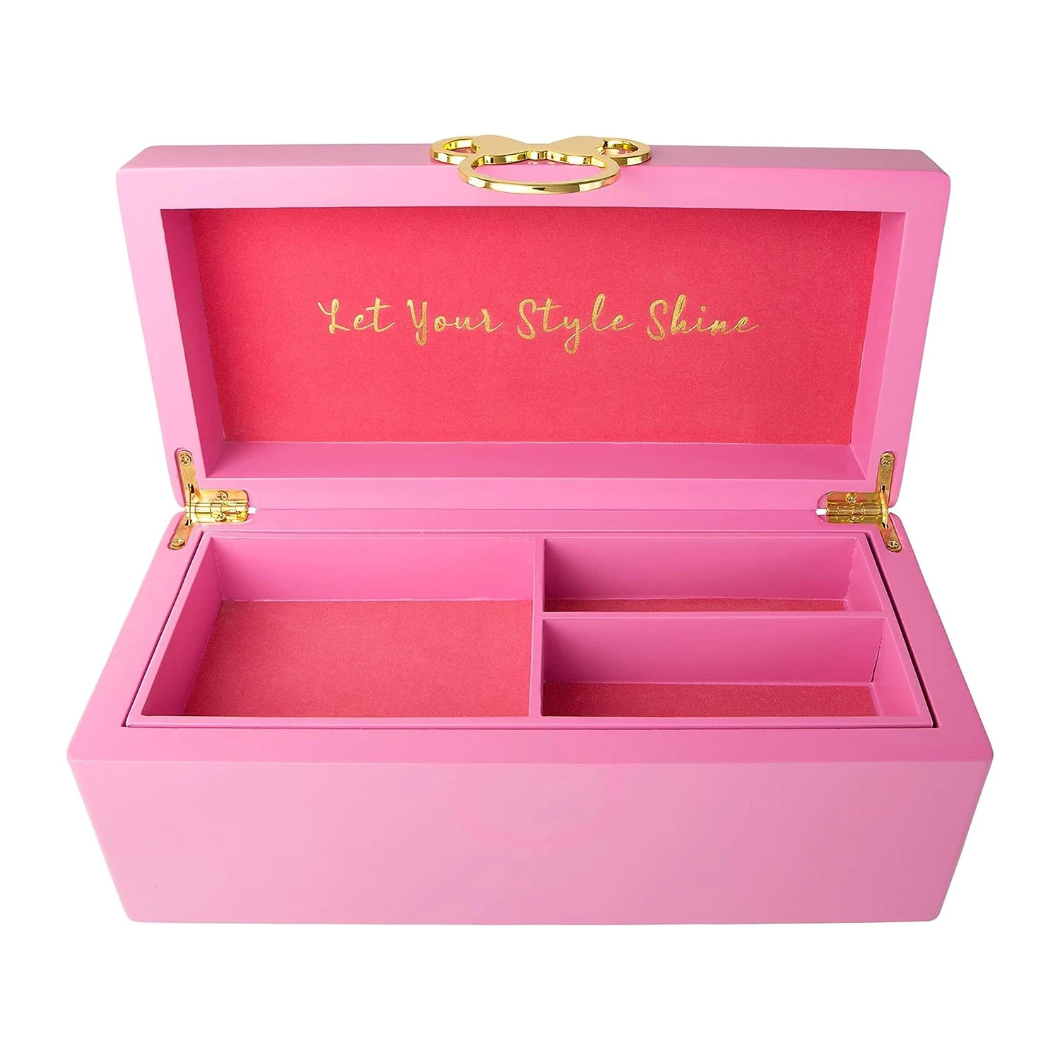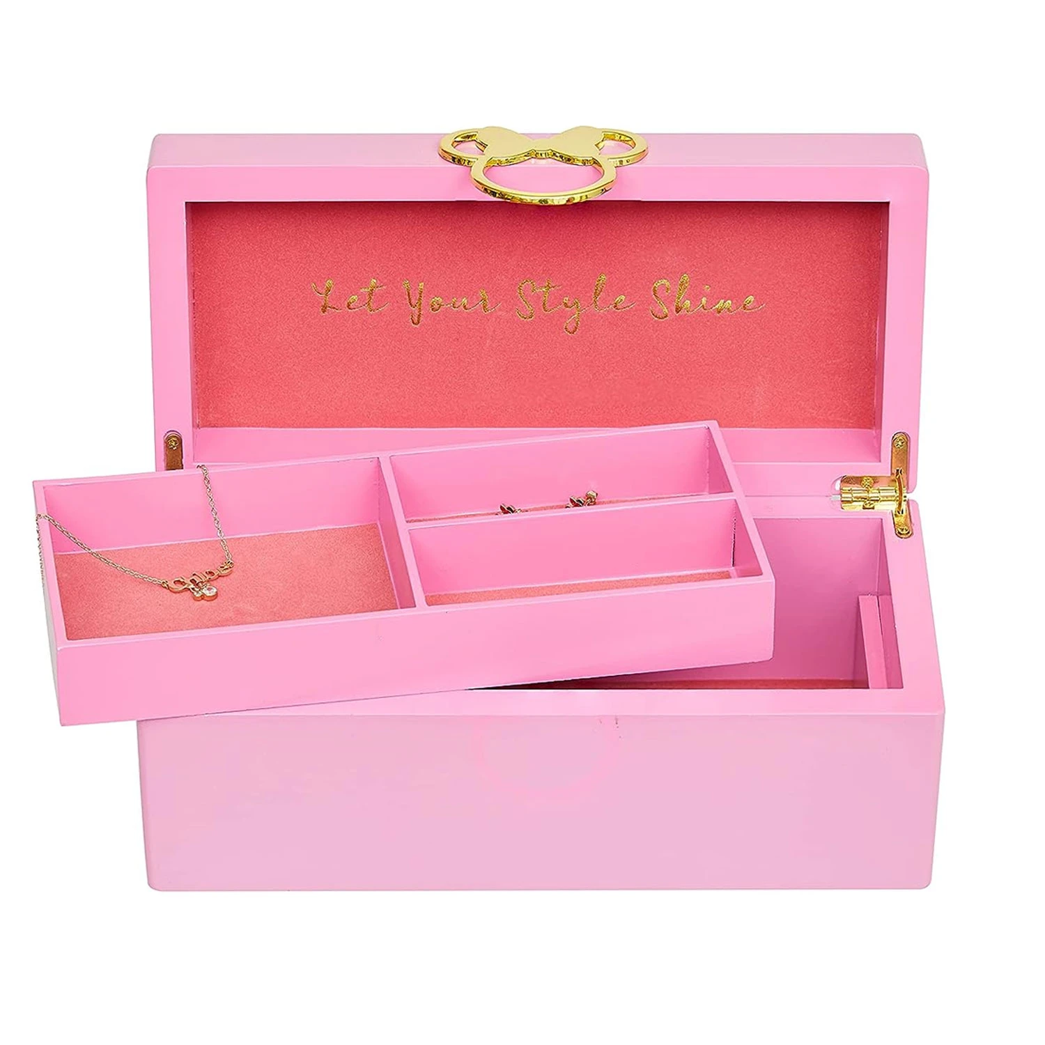 Disney Minnie Mouse pink wooden jewellery box. Store your jewellery like a true fashionista, just like Minnie Mouse! Crafted in pink lacquered wood, with a gold Minnie Mouse motif handle this jewellery box makes the perfect gift for any Disney lover. The inside of this jewellery case features the slogan “Let Your Style Shine” on faux suede as well as ample storage for large items underneath the removable inner tray.
